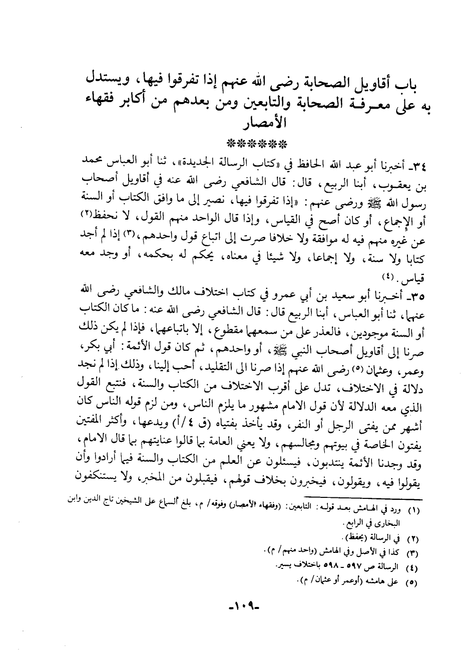 34 - أَخْبَرَنَا أَبُو عَبْدِ اللَّهِ الْحَافِظُ، فِي كِتَابِ الرِّسَالَةِ الْجَدِيدَةِ: ثنا أَبُو الْعَبَّاسِ مُحَمَّدُ بْنُ يَعْقُوبَ , أَبْنَا الرَّبِيعُ قَالَ: قَالَ الشَّافِعِيُّ رَضِيَ اللَّهُ عَنْهُ فِي أَقَاوِيلِ أَصْحَابِ رَسُولِ اللَّهِ صَلَّى اللهُ عَلَيْهِ وَسَلَّمَ وَرَضِيَ عَنْهُمْ: §" إِذَا تَفَرَّقُوا فِيهَا نَصِيرُ إِلَى مَا وَافَقَ الْكِتَابَ أَوِ السُّنَّةَ أَوِ الْإِجْمَاعَ، أَوْ كَانَ أَصَحَّ فِي الْقِيَاسِ , وَإِذَا قَالَ الْوَاحِدُ مِنْهُمُ الْقَوْلَ لَا نَحْفَظُ عَنْ غَيْرِهِ مِنْهُمْ فِيهِ لَهُ مُوَافَقَةً وَلَا خِلَافًا , صِرْتُ إِلَى اتِّبَاعِ قَوْلِ وَاحِدِهِمْ، إِذَا لَمْ أَجِدْ كِتَابًا وَلَا سُنَّةً وَلَا إِجْمَاعًا وَلَا شَيْئًا فِي مَعْنَاهُ يُحْكَمُ لَهُ بِحُكْمِهِ أَوْ وُجِدَ مَعَهُ قِيَاسٌ