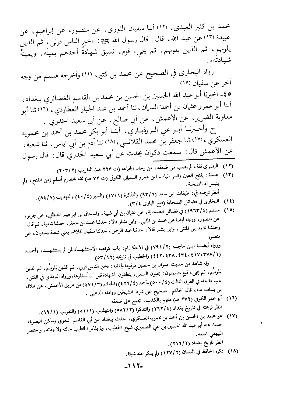 45 - أَخْبَرَنَا أَبُو عَبْدِ اللَّهِ الْحُسَيْنُ بْنُ الْحَسَنِ بْنِ مُحَمَّدِ بْنِ الْقَاسِمِ الْغَضَائِرِيُّ، بِبَغْدَادَ , أبنا أَبُو عَمْرٍو عُثْمَانُ بْنُ أَحْمَدَ بْنِ السَّمَّاكِ , ثنا أَحْمَدُ بْنُ عَبْدِ الْجَبَّارِ الْعُطَارِدِيُّ، ثنا أَبُو مُعَاوِيَةَ الضَّرِيرُ، عَنِ الْأَعْمَشِ، عَنْ أَبِي صَالِحٍ، عَنْ أَبِي سَعِيدٍ الْخُدْرِيِّ، ح وَأَخْبَرَنَا أَبُو عَلِيٍّ الرُّوذْبَارِيُّ، أبنا أَبُو بَكْرٍ مُحَمَّدُ بْنُ أَحْمَدَ بْنِ مَحْمَوَيْهِ الْعَسْكَرِيُّ , ثنا جَعْفَرُ بْنُ مُحَمَّدٍ الْقَلَانِسِيُّ، ثنا آدَمُ بْنُ أَبِي إِيَاسٍ، ثنا شُعْبَةُ، عَنِ الْأَعْمَشِ قَالَ: سَمِعْتُ ذَكْوَانَ، يُحَدِّثُ عَنْ أَبِي سَعِيدٍ الْخُدْرِيِّ قَالَ: قَالَ رَسُولُ -[113]- اللَّهِ صَلَّى اللهُ عَلَيْهِ وَسَلَّمَ: §«لَا تَسُبُّوا أَصْحَابِي , فَلَوْ أَنَّ أَحَدَكُمْ أَنْفَقَ مِثْلَ أُحُدٍ ذَهَبًا مَا بَلَغَ مُدَّ أَحَدِهِمْ وَلَا نُصَيْفَهُ» وَفِي رِوَايَةِ أَبِي مُعَاوِيَةَ «فَوَالَّذِي نَفْسِي بِيدِهِ لَوْ أَنَّ أَحَدَكُمْ» زَادَ شُعْبَةُ فِي رِوَايتِهِ: " وَلَا يُبْغِضُ الْأَنْصَارَ رَجُلٌ يؤْمِنُ بِاللَّهِ وَالْيَوْمِ الْآخِرِ رَوَاهُ الْبُخَارِيُّ فِي الصَّحِيحِ عَنْ آدَمَ قَالَ: وَتَابَعَهُ أَبُو مُعَاوِيَةَ وَغَيْرُهُ.