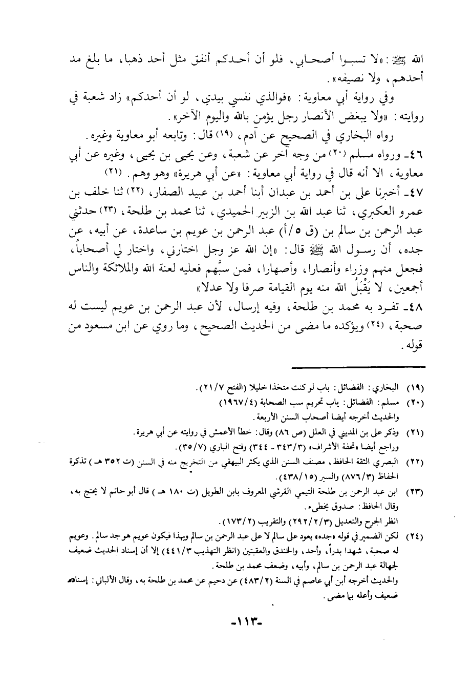 48 - تَفَرَّدَ بِهِ مُحَمَّدُ بْنُ طَلْحَةَ، وَفِيهِ إِرْسَالٌ، لِأَنَّ عَبْدَ الرَّحْمَنِ بْنَ عُوَيْمٍ لَيْسَتْ لَهُ صُحْبَةٌ، وَيُؤَكِدُهُ مَا مَضَى مِنَ الْحَدِيثِ الصَّحِيحِ، وَمَا رُوِي عَنِ ابْنِ مَسْعُودٍ مِنْ قَوْلِهِ
