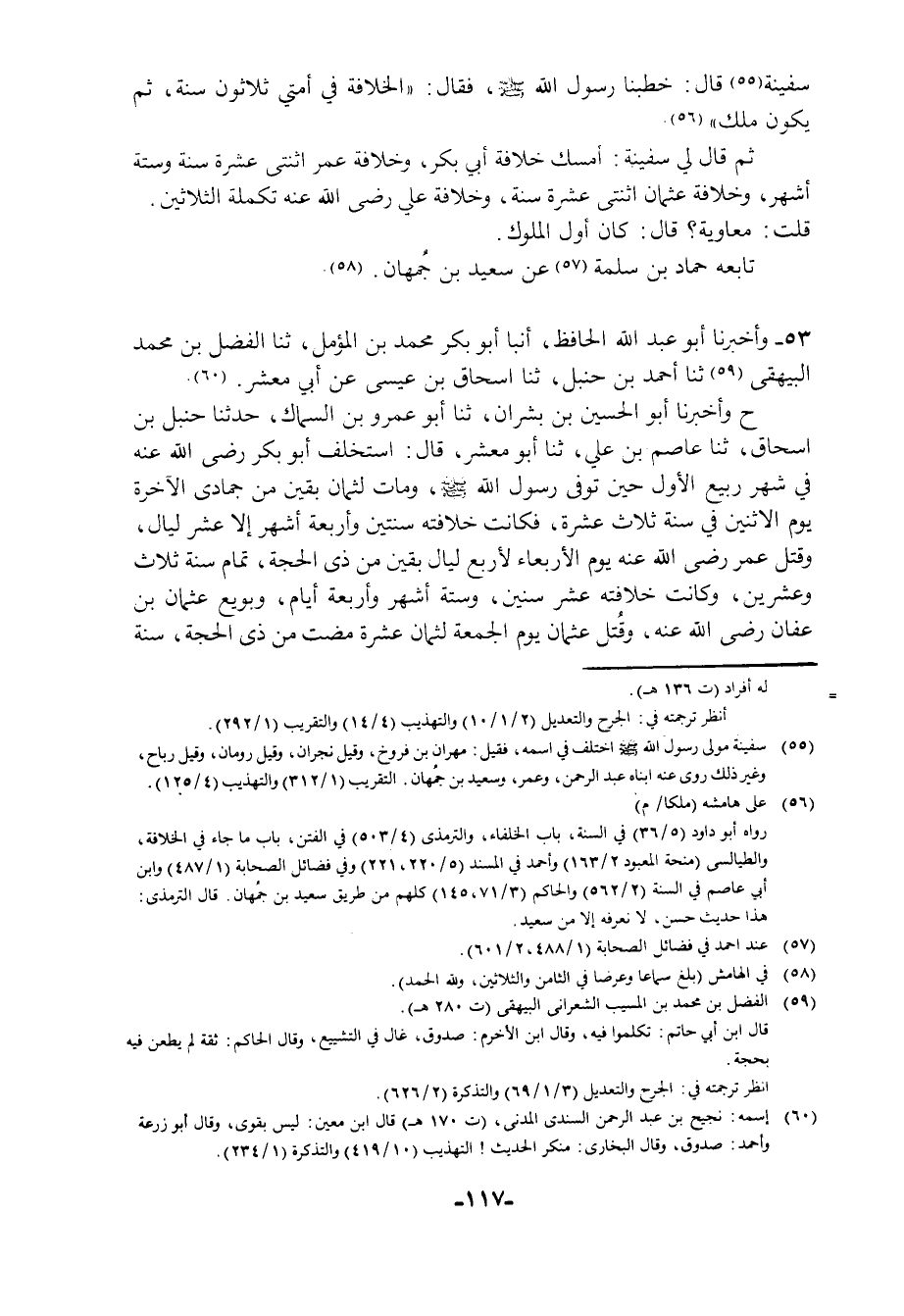 53 - وَأَخْبَرَنَا أَبُو عَبْدِ اللَّهِ الْحَافِظُ، أنبا أَبُو بَكْرٍ مُحَمَّدُ بْنُ الْمُؤَمَّلِ , ثنا الْفَضْلُ بْنُ مُحَمَّدٍ الْبَيْهَقِيُّ، ثنا أَحْمَدُ بْنُ حَنْبَلٍ، ثنا إِسْحَاقُ بْنُ عِيسَى، عَنْ أَبِي مَعْشَرٍ. ح وَأَخْبَرَنَا أَبُو الْحُسَيْنِ بْنُ بِشْرَانَ، ثنا أَبُو عَمْرِو بْنُ السَّمَّاكِ، حَدَّثَنَا حَنْبَلُ بْنُ إِسْحَاقَ، ثنا عَاصِمُ بْنُ عَلِيٍّ، ثنا أَبُو مَعْشَرٍ قَالَ: §«اسْتُخْلِفَ أَبُو بَكْرٍ رَضِيَ اللَّهُ عَنْهُ فِي شَهْرِ رَبِيعٍ الْأَوَّلِ , حِينَ تُوُفِّيَ رَسُولُ اللَّهِ صَلَّى اللهُ عَلَيْهِ وَسَلَّمَ , وَمَاتَ لِثَمَانٍ بَقِينَ مِنْ جُمَادَى الْآخِرَةِ , يَوْمَ الِاثْنَيْنِ فِي سَنَةِ ثَلَاثَ عَشْرَةَ , فَكَانَتْ خِلَافَتُهُ سَنَتَيْنِ وَأَرْبَعَةَ أَشْهُرٍ إِلَّا عَشَرَ لَيَالٍ , وَقُتِلَ عُمَرُ رَضِيَ اللَّهُ عَنْهُ يَوْمَ الْأَرْبِعَاءِ لِأَرْبَعِ لَيَالٍ بَقِينَ مِنْ ذِي الْحِجَّةِ , تَمَامَ سَنَةِ ثَلَاثٍ وَعِشْرِينَ , وَكَانَتْ خِلَافَتُهُ عَشَرَ سِنِينَ وَسِتَّةَ أَشْهُرٍ وَأَرْبَعَةَ أَيَّامٍ , وَبُويِعَ عُثْمَانُ بْنُ عَفَّانَ رَضِيَ اللَّهُ عَنْهُ , وَقُتِلَ عُثْمَانُ يَوْمَ الْجُمُعَةِ لِثَمَانَ عَشْرَةَ مَضَتْ مِنْ ذِي الْحِجَّةَ سَنَةَ -[118]- خَمْسٍ وَثَلَاثِينَ , وَكَانَتْ خِلَافَتُهُ اثْنَتَيْ عَشْرَةَ سَنَةً إِلَّا اثْنَيْ عَشَرَ يَوْمًا , ثُمَّ بُويعَ لِعَلِيِّ بْنِ أَبِي طَالِبٍ رَضِيَ اللَّهُ عَنْهُ سَنَةَ خَمْسٍ وَثَلَاثِينَ , وَقُتِلَ فِي رَمَضَانَ يَوْمَ الْجُمُعَةِ لِسَبْعَ عَشْرَةَ لَيْلَةً مِنْ رَمَضَانَ سَنَةَ أَرْبَعِينَ , وَكَانَتْ خِلَافَتُهُ خَمْسَ سِنِينَ إِلَّا ثَلَاثَةَ أَشْهُرٍ»