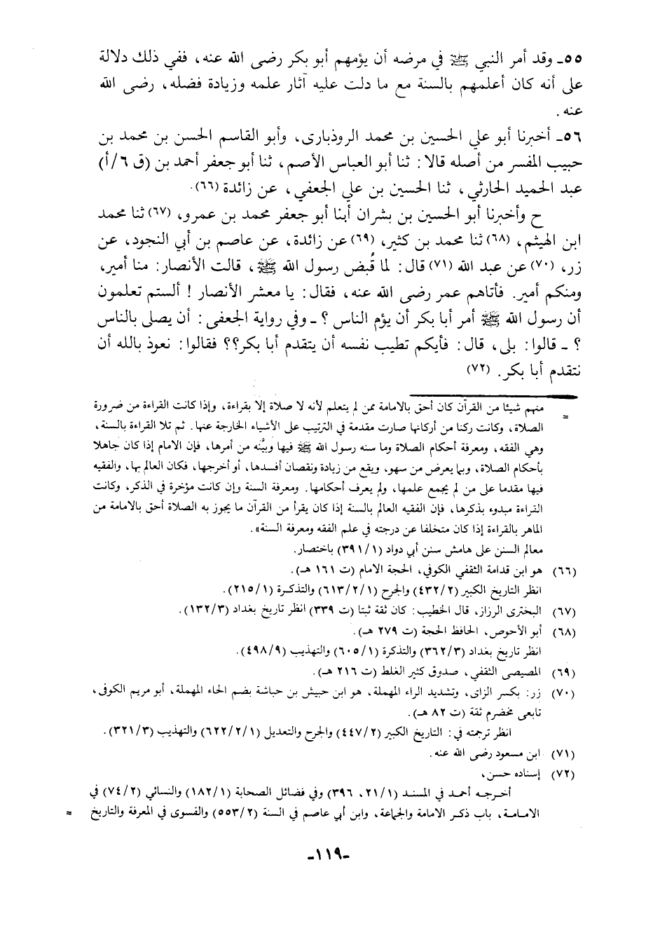 56 - أَخْبَرَنَا أَبُو عَلِيٍّ الْحُسَيْنُ بْنُ مُحَمَّدٍ الرُّوذْبَارِيُّ، وَأَبُو الْقَاسِمِ الْحَسَنُ بْنُ مُحَمَّدِ بْنِ حُبَيْبٍ الْمُفَسِّرُ، مِنْ أَصْلِهِ قَالَا: ثنا أَبُو الْعَبَّاسِ الْأَصَمُّ، ثنا أَبُو جَعْفَرٍ أَحْمَدُ بْنُ عَبْدِ الْحَمِيدِ الْحَارِثِيُّ , ثنا الْحُسَيْنُ بْنُ عَلِيٍّ الْجُعْفِيُّ، عَنْ زَائِدَةَ، ح وَأَخْبَرَنَا أَبُو الْحُسَيْنِ بْنُ بِشْرَانَ، أبنا أَبُو جَعْفَرٍ مُحَمَّدُ بْنُ عَمْرٍو , ثنا مُحَمَّدُ بْنُ الْهَيْثَمِ، ثنا مُحَمَّدُ بْنُ كَثِيرٍ، عَنْ زَائِدَةَ، عَنْ عَاصِمِ بْنِ أَبِي النَّجُودِ، عَنْ زِرٍّ، عَنْ عَبْدِ اللَّهِ قَالَ: §لَمَّا قُبِضَ رَسُولُ اللَّهِ صَلَّى اللهُ عَلَيْهِ وَسَلَّمَ قَالَتِ الْأَنْصَارُ: مِنَّا أَمِيرٌ وَمِنْكُمْ أَمِيرٌ فَأَتَاهُمْ عُمَرُ رَضِيَ اللَّهُ عَنْهُ فَقَالَ: يَا مَعْشَرَ الْأَنْصَارِ أَلَسْتُمْ تَعْلَمُونَ أَنَّ رَسُولَ اللَّهِ صَلَّى اللهُ عَلَيْهِ وَسَلَّمَ أَمَرَ أَبَا بَكْرٍ أَنْ يَؤُمَّ النَّاسَ؟ وَفِي رِوَايَةِ الْجُعْفِيِّ أَنْ يُصَلِّيَ بِالنَّاسِ، قَالُوا: بَلَى قَالَ: فَأَيُّكُمْ تَطِيبُ نَفْسُهُ أَنْ يَتَقَدَّمَ أَبَا بَكْرٍ فَقَالُوا: نَعُوذُ بِاللَّهِ أَنْ نَتَقَدَّمَ أَبَا بَكْرٍ "