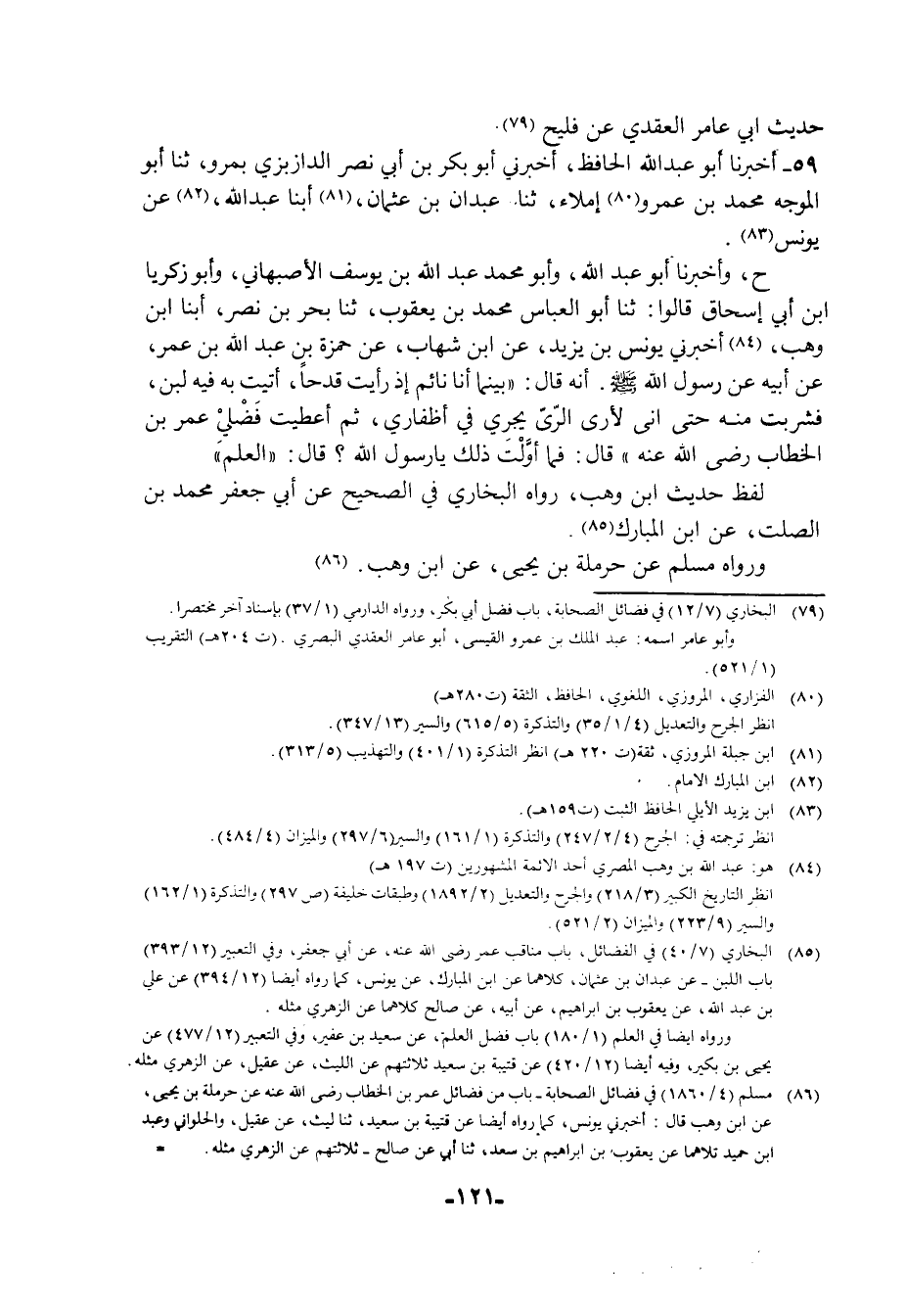 59 - أَخْبَرَنَا أَبُو عَبْدِ اللَّهِ الْحَافِظُ، أَخْبَرَنِي أَبُو بَكْرِ بْنُ أَبِي نَصْرٍ الدَّازْبَزِيُّ بِمَرْوٍ , ثنا أَبُو الْمُوَجِّهِ مُحَمَّدُ بْنُ عَمْرٍو إِمْلَاءً , ثنا عَبْدانُ بْنُ عُثْمَانَ، أبنا عَبْدُ اللَّهِ، عَنْ يُونُسَ، ح، وَأَخْبَرَنَا أَبُو عَبْدِ اللَّهِ، وَأَبُو مُحَمَّدٍ عَبْدُ اللَّهِ بْنُ يُوسُفَ الْأَصْبَهَانِيُّ، وَأَبُو زَكَرِيَّا بْنُ أَبِي إِسْحَاقَ قَالُوا: ثنا أَبُو الْعَبَّاسِ مُحَمَّدُ بْنُ يَعْقُوبَ , ثنا بَحْرُ بْنُ نَصْرٍ، أبنا ابْنُ وَهْبٍ، أَخْبَرَنِي يُونُسُ بْنُ يَزِيدَ، عَنِ ابْنِ شِهَابٍ، عَنْ حَمْزَةَ بْنِ عَبْدِ اللَّهِ بْنِ عُمَرَ، عَنْ أَبِيهِ، عَنْ رَسُولِ اللَّهِ صَلَّى اللهُ عَلَيْهِ وَسَلَّمَ أَنَّهُ قَالَ: §«بَيْنَمَا أَنَا نَائِمٌ إِذْ رَأَيْتُ قَدَحًا أُتِيتُ بِهِ فِيهِ لَبَنٌ فَشَرِبْتُ مِنْهُ حَتَّى أَنِّي لَأَرَى الرِّيَّ يَجْرِي فِي أَظْفَارِي , ثُمَّ أَعْطَيْتُ فَضْلِيَ عُمَرَ بْنَ الْخَطَّابِ رَضِيَ اللَّهُ عَنْهُ» ، قَالَ: فَمَا أَوَّلْتَ ذَلِكَ يَا رَسُولَ اللَّهِ؟، قَالَ: «الْعِلْمُ» لَفْظُ حَدِيثِ ابْنِ وَهْبٍ رَوَاهُ الْبُخَارِيُّ فِي الصَّحِيحِ عَنْ أَبِي جَعْفَرٍ مُحَمَّدِ بْنِ الصَّلْتِ عَنِ ابْنِ الْمُبَارَكِ وَرَوَاهُ مُسْلِمٌ عَنْ حَرْمَلَةَ بْنِ يَحْيَى عَنِ ابْنِ وَهْبٍ