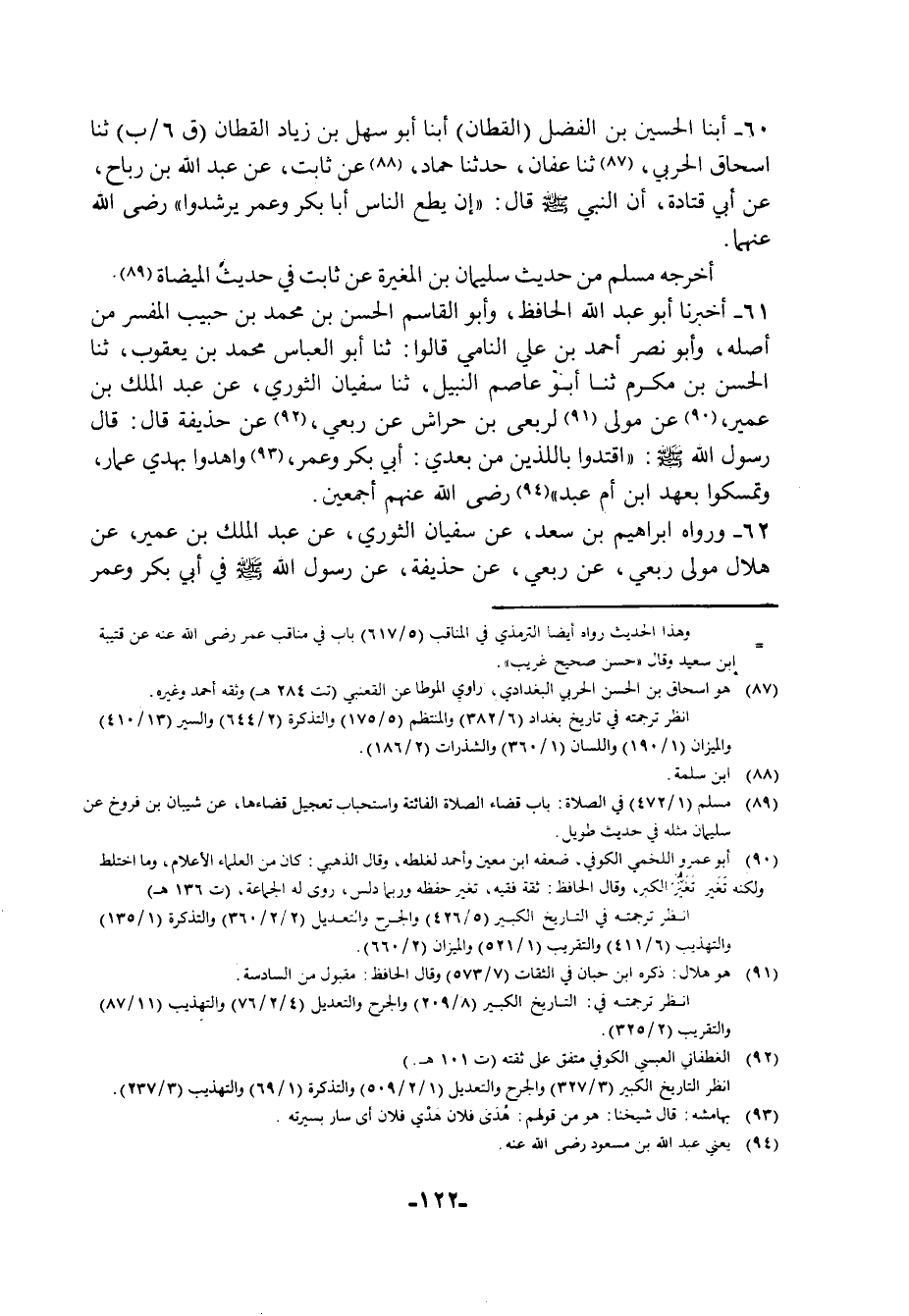 61 - أَخْبَرَنَا أَبُو عَبْدِ اللَّهِ الْحَافِظُ وَأَبُو الْقَاسِمِ الْحَسَنُ بْنُ مُحَمَّدِ بْنِ حُبَيْبٍ الْمُفَسِّرُ، مِنْ أَصْلِهِ وَأَبُو نَصْرٍ أَحْمَدُ بْنُ عَلِيٍّ الفَّامِيُّ قَالُوا: ثنا أَبُو الْعَبَّاسِ مُحَمَّدُ بْنُ يَعْقُوبَ , ثنا الْحَسَنُ بْنُ مُكْرَمٍ، ثنا أَبُو عَاصِمٍ النَّبِيلُ، ثنا سُفْيَانُ الثَّوْرِيُّ، عَنْ عَبْدِ الْمَلِكِ بْنِ عُمَيْرٍ، عَنْ مَوْلًى لِرِبْعِيِّ بْنِ حِرَاشٍ، عَنْ رِبْعِيٍّ، عَنْ حُذَيْفَةَ قَالَ: قَالَ رَسُولُ اللَّهِ صَلَّى اللهُ عَلَيْهِ وَسَلَّمَ: " §اقْتَدُوا بِاللَّذَيْنِ مِنْ بَعْدِي: أَبِي بَكْرٍ وَعُمَرَ وَاهْدُوا بِهَدْيِ عَمَّارٍ وَتَمَسَّكُوا بِعَهْدِ ابْنِ أُمِّ عَبْدٍ رَضِيَ اللَّهُ عَنْهُمْ أَجْمَعِينَ "
