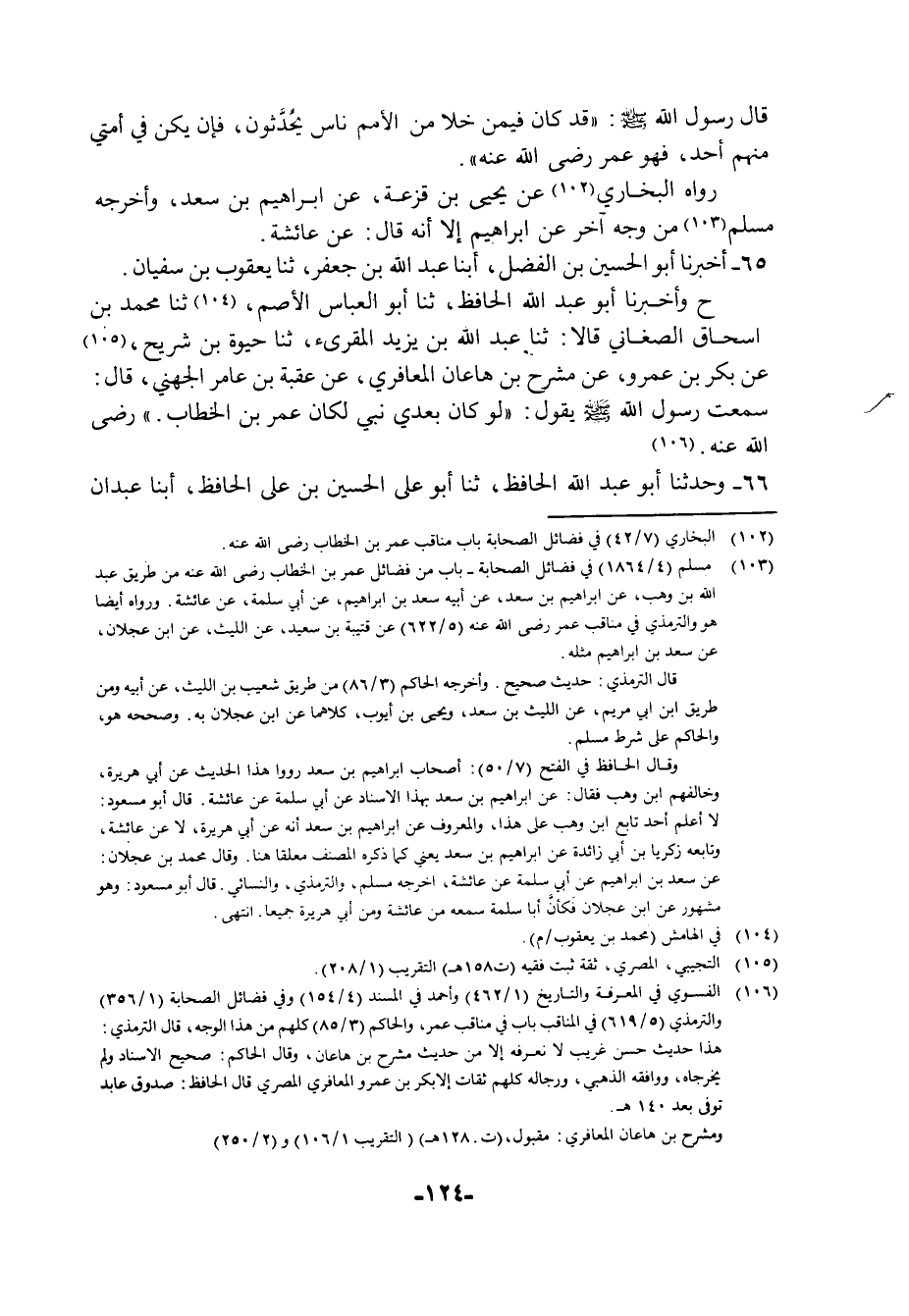 65 - أَخْبَرَنَا أَبُو الْحُسَيْنِ بْنُ الْفَضْلِ، أبنا عَبْدُ اللَّهِ بْنُ جَعْفَرٍ، ثنا يَعْقُوبُ بْنُ سُفْيَانَ، ح وَأَخْبَرَنَا أَبُو عَبْدِ اللَّهِ الْحَافِظُ، ثنا أَبُو الْعَبَّاسِ الْأَصَمُّ، ثنا مُحَمَّدُ بْنُ إِسْحَاقَ الصَّغَانِيُّ، قَالَا: ثنا عَبْدُ اللَّهِ بْنُ يَزِيدَ الْمُقْرِئُ، ثنا حَيْوَةُ بْنُ شُرَيْحٍ، عَنْ بَكْرِ بْنِ عَمْرٍو، عَنْ مِشْرَحِ بْنِ هَاعَانَ الْمَعَافِرِيِّ، عَنْ عُقْبَةَ بْنِ عَامِرٍ الْجُهَنِيِّ قَالَ: سَمِعْتُ رَسُولَ اللَّهِ صَلَّى اللهُ عَلَيْهِ وَسَلَّمَ يَقُولُ: §«لَوْ كَانَ بَعْدِي نَبِيٌّ لَكَانَ عُمَرُ بْنُ الْخَطَّابِ رَضِيَ اللَّهُ عَنْهُ»
