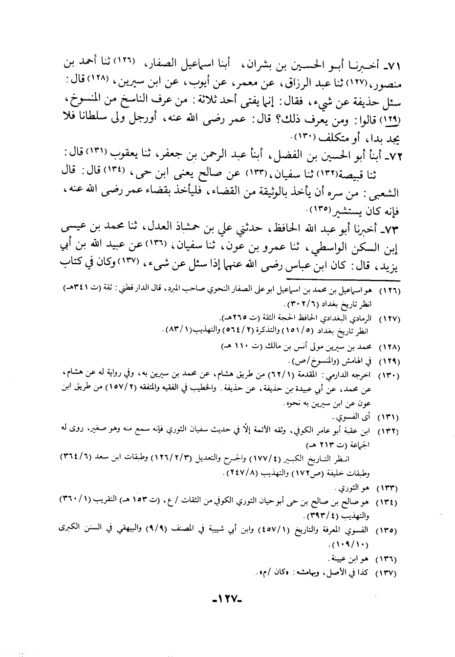 71 - أَخْبَرَنَا أَبُو الْحُسَيْنِ بْنُ بِشْرَانَ، أبنا إِسْمَاعِيلُ الصَّفَّارُ، ثنا أَحْمَدُ بْنُ مَنْصُورٍ، ثنا عَبْدُ الرَّزَّاقِ، عَنْ مَعْمَرٍ، عَنْ أَيُّوبَ، عَنِ ابْنِ سِيرِينَ قَالَ: سُئِلَ حُذَيْفَةُ عَنْ شَيْءٍ فَقَالَ: " §إِنَّمَا يُفْتِي أَحَدُ ثَلَاثَةَ: مَنْ عَرَفَ النَّاسِخَ مِنَ الْمَنْسُوخِ "، قَالُوا: وَمَنْ يَعْرِفُ ذَلِكَ؟ قَالَ: «عُمَرُ رَضِيَ اللَّهُ عَنْهُ , أَوْ رَجُلٌ وَلِيَ سُلْطَانًا فَلَا يَجِدُ بُدًّا , أَوْ مُتَكَلِّفٌ»