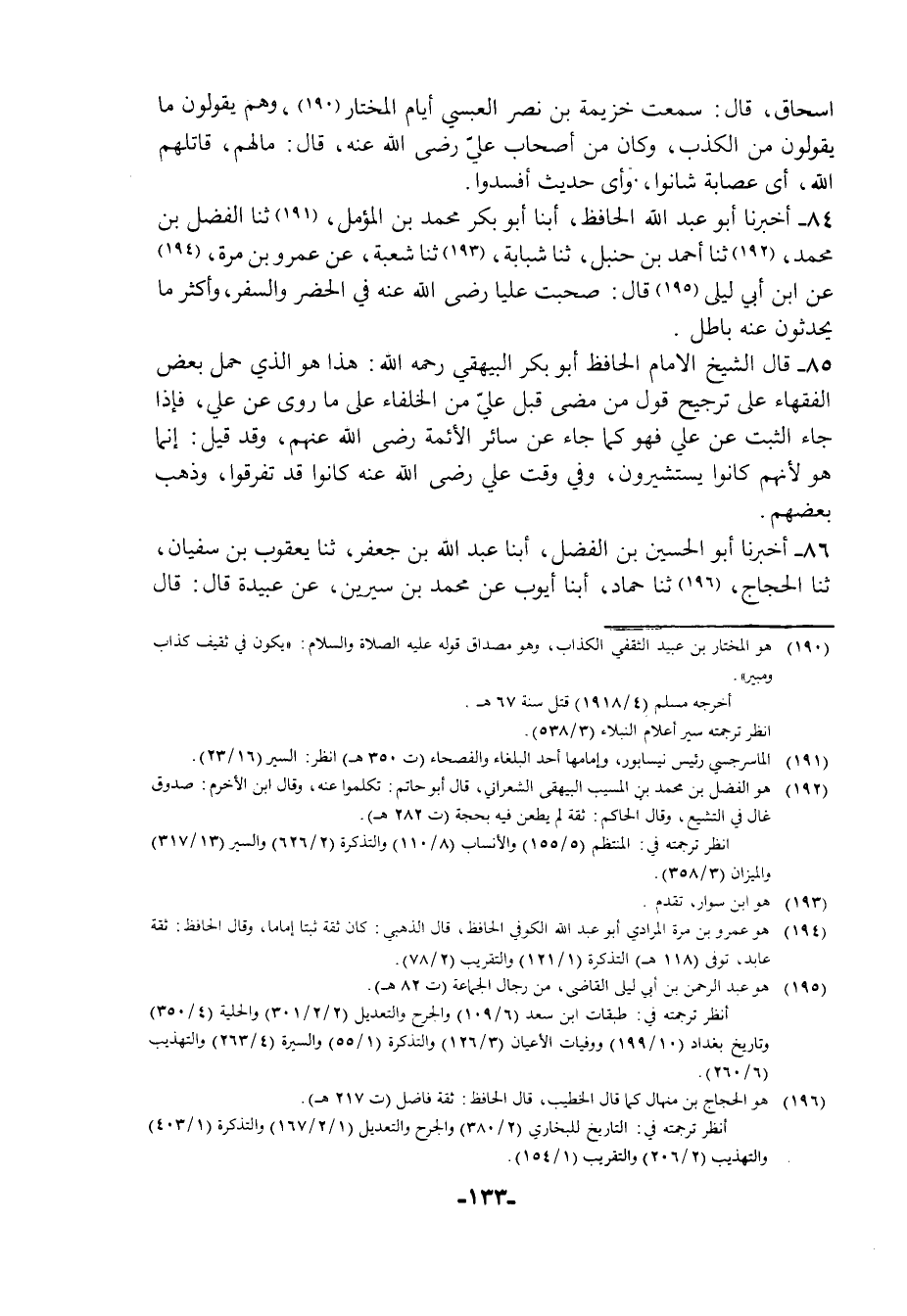 85 - قَالَ الشَّيْخُ الْإِمَامُ الْحَافِظُ أَبُو بَكْرٍ الْبَيْهَقِيُّ - رَحِمَهُ اللَّهُ -: هَذَا هُوَ الَّذِي حَمَلَ بَعْضَ الْفُقَهَاءِ عَلَى تَرْجِيحِ قَوْلِ مَنْ مَضَى قَبْلَ عَلِيٍّ مِنَ الْخُلَفَاءِ عَلَى مَا رُوِيَ عَنْ عَلِيٍّ , فَإِذَا جَاءَ الثَّبَتُ عَنْ عَلِيٍّ فَهُوَ كَمَا جَاءَ عَنْ سَائِرِ الْأَئِمَّةِ رَضِيَ اللَّهُ عَنْهُمْ , وَقَدْ قِيلَ إِنَّمَا هُوَ لِأَنَّهُمْ كَانُوا يَسْتَشِيرُونَ , وَفِي وَقْتِ عَلِيٍّ رَضِيَ اللَّهُ عَنْهُ كَانُوا قَدْ تَفَرَّقُوا وَذَهَبَ بَعْضُهُمْ