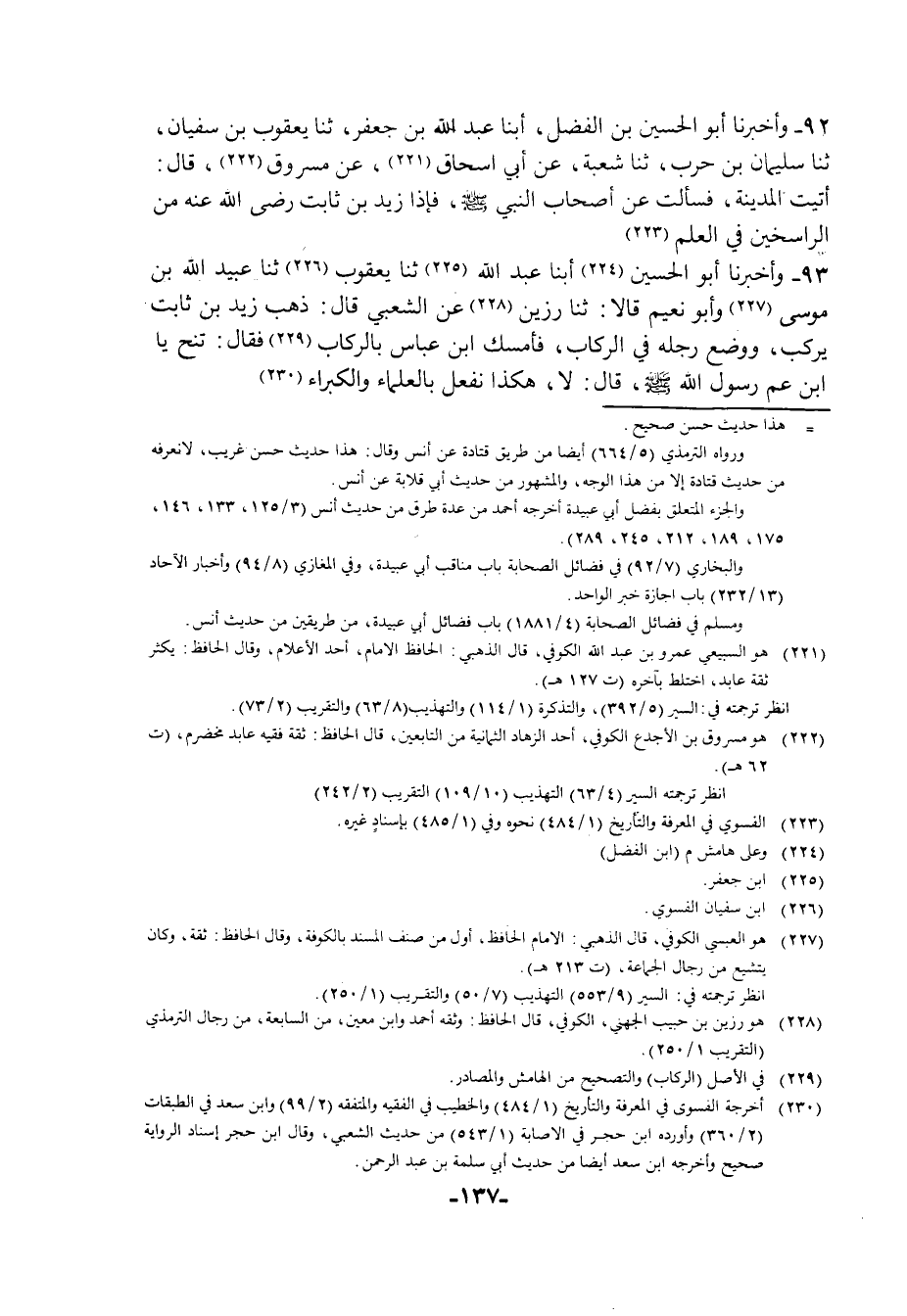 93 - وَأَخْبَرَنَا أَبُو الْحُسَيْنِ، أبنا عَبْدُ اللَّهِ، ثنا يَعْقُوبُ، ثنا عُبَيْدُ اللَّهِ بْنُ مُوسَى، وَأَبُو نُعَيْمٍ قَالَا: ثنا رَزِينٌ، عَنِ الشَّعْبِيِّ قَالَ: §ذَهَبَ زَيْدُ بْنُ ثَابِتٍ يَرْكَبُ , وَوَضَعَ رِجْلَهُ فِي الرِّكَابِ , فَأَمْسَكَ ابْنُ عَبَّاسٍ بِالرِّكَابِ , فَقَالَ: تَنَحَّ يَا ابْنَ عَمِّ رَسُولِ اللَّهِ صَلَّى اللهُ عَلَيْهِ وَسَلَّمَ , قَالَ: لَا هَكَذَا نَفْعَلُ بِالْعُلَمَاءِ وَالْكُبَرَاءِ