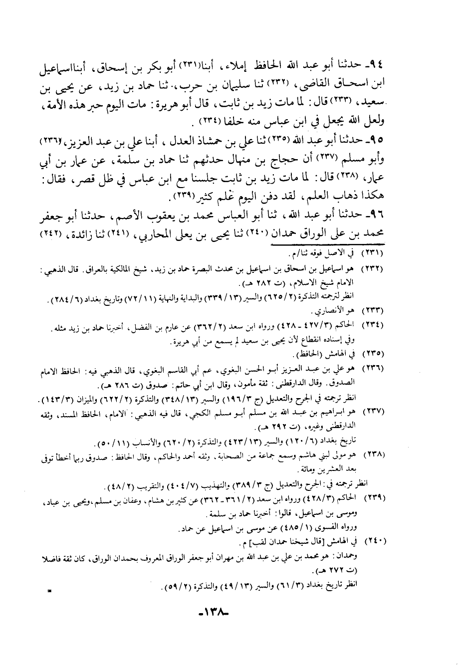 95 - حَدَّثَنَا أَبُو عَبْدِ اللَّهِ، ثنا عَلِيُّ بْنُ حَمْشَاذٍ الْعَدْلُ، أبنا عَلِيُّ بْنُ عَبْدِ الْعَزِيزِ، وَأَبُو مُسْلِمٍ , أَنَّ حَجَّاجَ بْنَ مِنْهَالٍ، حَدَّثَهُمْ , ثنا حَمَّادُ بْنُ سَلَمَةَ، عَنْ عَمَّارِ بْنِ أَبِي عَمَّارٍ قَالَ: §لَمَّا مَاتَ زَيْدُ بْنُ ثَابِتٍ جَلَسْنَا مَعَ ابْنِ عَبَّاسٍ فِي ظِلِّ قَصْرٍ فَقَالَ: هَكَذَا ذَهَابُ الْعِلْمِ , لَقَدْ دُفِنَ الْيَوْمَ عِلْمٌ كَثِيرٌ