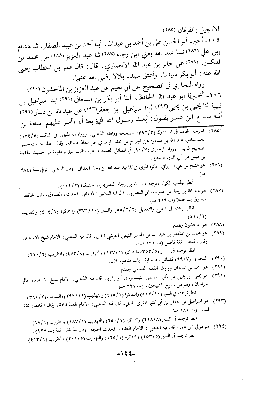 106 - أَخْبَرَنَا أَبُو عَبْدِ اللَّهِ الْحَافِظُ، أبنا أَبُو بَكْرِ بْنُ إِسْحَاقَ، , أبنا إِسْمَاعِيلُ بْنُ قُتَيْبَةَ، , ثنا يَحْيَى بْنُ يَحْيَى، أبنا إِسْمَاعِيلُ بْنُ جَعْفَرٍ، عَنْ عَبْدِ اللَّهِ بْنِ دِينَارٍ، أَنَّهُ سَمِعَ ابْنَ عُمَرَ يَقُولُ: بَعَثَ رَسُولُ اللَّهِ صَلَّى اللهُ عَلَيْهِ وَسَلَّمَ بَعْثًا , وَأَمَّرَ عَلَيْهِمْ أُسَامَةَ بْنَ -[145]- زَيْدٍ , فَطَعَنَ النَّاسُ فِي إِمْرَتِهِ , فَقَامَ رَسُولُ اللَّهِ صَلَّى اللهُ عَلَيْهِ وَسَلَّمَ فَقَالَ: §«إِنْ تَطْعَنُوا فِي إِمْرَتِهِ , فَقَدْ كُنْتُمْ تَطْعَنُونَ فِي إِمْرَةِ أَبِيهِ مِنْ قَبْلُ , وَايْمُ اللَّهِ إِنْ كَانَ لَخَلِيقًا لِلْإِمَارَةِ , وَإِنْ كَانَ لَمِنْ أَحَبِّ النَّاسِ إِلَيَّ , وَإِنَّ هَذَا لَمِنْ أَحَبِّ النَّاسِ إِلَىَّ بَعْدَهُ» رَوَاهُ مُسْلِمٌ فِي الصَّحِيحِ , عَنْ يَحْيَى بْنِ يَحْيَى وَغَيْرِهِ , وَرَوَاهُ الْبُخَارِيُّ عَنْ قُتَيْبَةَ عَنْ إِسْمَاعِيلَ