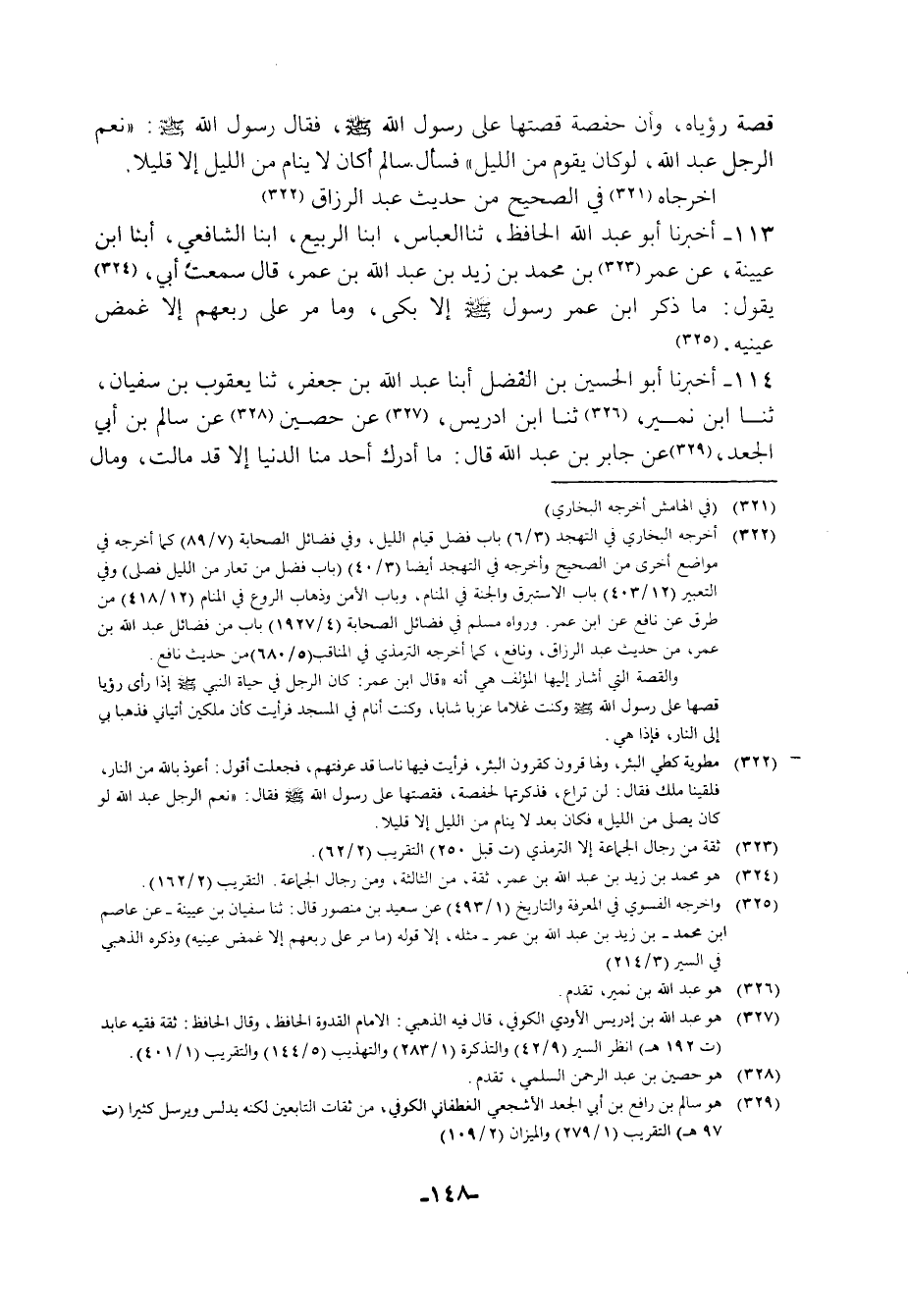 113 - أَخْبَرَنَا أَبُو عَبْدِ اللَّهِ الْحَافِظُ، ثنا الْعَبَّاسُ، أبنا الرَّبِيعُ، أبنا الشَّافِعِيُّ، أبنا ابْنُ عُيَيْنَةَ، عَنْ عُمَرَ بْنِ مُحَمَّدِ بْنِ زَيْدِ بْنِ عَبْدِ اللَّهِ بْنِ عُمَرَ قَالَ: سَمِعْتُ أَبِي يَقُولُ: §مَا ذَكَرَ ابْنُ عُمَرَ رَسُولَ اللَّهِ صَلَّى اللهُ عَلَيْهِ وَسَلَّمَ إِلَّا بَكَى , وَمَا مَرَّ عَلَى رَبْعِهِمْ إِلَّا غَمَّضَ عَيْنَيْهِ