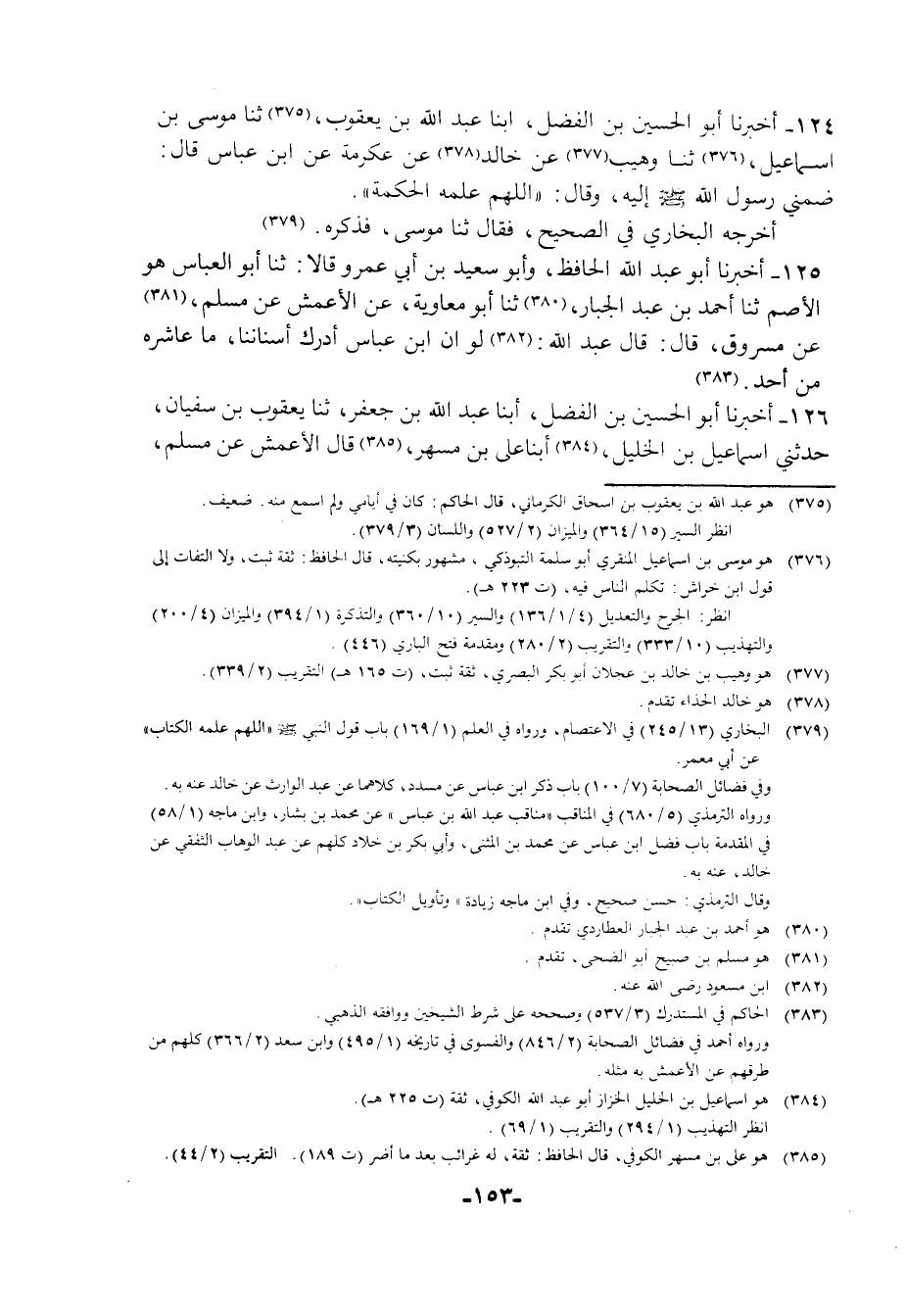 124 - أَخْبَرَنَا أَبُو الْحُسَيْنِ بْنُ الْفَضْلِ، أبنا عَبْدُ اللَّهِ بْنُ يَعْقُوبَ، ثنا مُوسَى بْنُ إِسْمَاعِيلَ، ثنا وَهَيْبٌ، عَنْ خَالِدٍ، عَنْ عِكْرِمَةَ، عَنِ ابْنِ عَبَّاسٍ قَالَ: ضَمَّنِي رَسُولُ اللَّهِ صَلَّى اللهُ عَلَيْهِ وَسَلَّمَ إِلَيْهِ , وَقَالَ: §«اللَّهُمَّ عَلِّمْهُ الْحِكْمَةَ» أَخْرَجَهُ الْبُخَارِيُّ فِي الصَّحِيحِ , فَقَالَ: ثَنَا مُوسَى فَذَكَرَهُ