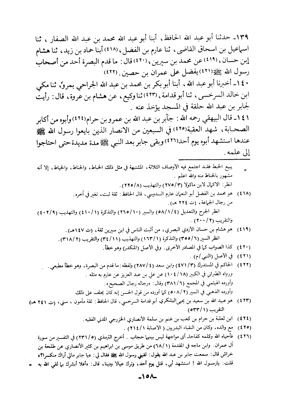 141 - قَالَ الْبَيْهَقِيُّ رَحِمَهُ اللَّهُ: جَابِرُ بْنُ عَبْدِ اللَّهِ بْنِ عَمْرِو بْنِ حَرَامٍ وَأَبُوهُ مِنْ أَكَابِرِ الصَّحَابَةِ , شَهِدَ الْعَقَبَةَ فِي السَّبْعِينَ مِنَ الْأَنْصَارِ , الَّذِينَ بَايِعُوا رَسُولَ اللَّهِ صَلَّى اللهُ عَلَيْهِ وَسَلَّمَ عِنْدَهَا , اسْتُشْهِدَ أَبُوهُ يَوْمَ أَحَدٍ , وَبَقِيَ جَابِرٌ بَعْدَ النَّبِيِّ صَلَّى اللهُ عَلَيْهِ وَسَلَّمَ مُدَّةً مَدِيدَةً حَتَّى احْتَاجُوا إِلَى عِلْمِهِ