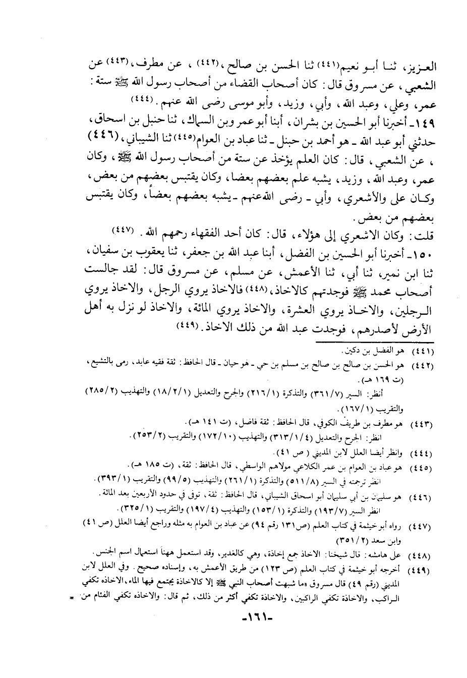 149 - أَخْبَرَنَا أَبُو الْحُسَيْنِ بْنُ بِشْرَانَ، أبنا أَبُو عَمْرِو بْنُ السَّمَّاكِ، ثنا حَنْبَلُ بْنُ إِسْحَاقَ، حَدَّثَنِي أَبُو عَبْدِ اللَّهِ هُوَ أَحْمَدُ بْنُ حَنْبَلٍ , ثنا عَبَّادُ بْنُ الْعَوَّامِ، ثنا الشَّيْبَانِيٌّ، عَنِ الشَّعْبِيِّ قَالَ: §كَانَ الْعِلْمُ يُؤْخَذُ عَنْ سِتَّةٍ مِنْ أَصْحَابِ رَسُولِ اللَّهِ صَلَّى اللهُ عَلَيْهِ وَسَلَّمَ , وَكَانَ عُمَرُ , وَعَبْدُ اللَّهِ , وَزَيْدٌ , يُشْبِهُ عِلْمُ بَعْضِهِمْ بَعْضًا , وَكَانَ يَقْتَبِسُ بَعْضُهُمْ مِنْ بَعْضٍ , وَكَانَ عَلِيٌّ , وَالْأَشْعَرِيُّ , وَأُبَيٌّ , رَضِيَ اللَّهُ عَنْهُمْ , يُشْبِهُ بَعْضُهُمْ بَعْضًا , وَكَانَ يَقْتَبِسُ بَعْضُهُمْ مِنْ بَعْضِ , قُلْتُ: وَكَانَ الْأَشْعَرِيُّ إِلَى هَؤُلَاءِ؟ قَالَ: كَانَ أَحَدَ الْفُقَهَاءِ رَحِمَهُمُ اللَّهُ