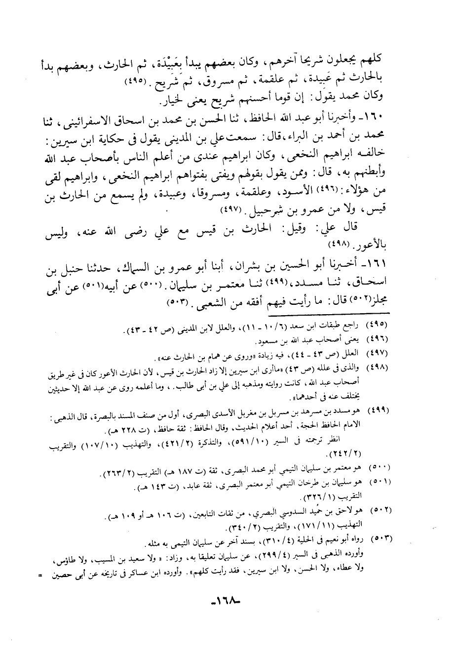 160 - وَأَخْبَرَنَا أَبُو عَبْدِ اللَّهِ الْحَافِظُ، ثنا الْحَسَنُ بْنُ مُحَمَّدِ بْنِ إِسْحَاقَ الْإِسْفِرَايِينِيُّ، ثنا مُحَمَّدُ بْنُ أَحْمَدَ بْنِ الْبَرَاءِ، قَالَ: سَمِعْتُ عَلِيَّ بْنَ الْمَدِينِيِّ يَقُولُ فِي حِكَايةِ ابْنِ سِيرِينَ: خَالَفَهُ إِبْرَاهِيمُ النَّخَعِيُّ , وَكَانَ إِبْرَاهِيمُ عِنْدِي مِنْ أَعْلَمِ النَّاسِ بِأَصْحَابِ عَبْدِ اللَّهِ وَأَبْطَنِهِمْ بِهِ قَالَ: §وَمِمَّنْ يَقُولُ بِقَوْلِهِمْ وَيُفْتِي بِفَتْوَاهُمْ إِبْرَاهِيمُ النَّخَعِيُّ , وَإِبْرَاهِيمُ لَقِي مِنْ هَؤُلَاءِ الْأَسْوَدَ , وَعَلْقَمَةَ , وَمَسْرُوقًا , وَعُبَيْدَةَ , وَلَمْ يَسْمَعْ مِنَ الْحَارِثِ بْنِ قَيْسٍ , وَلَا مِنْ عَمْرِو بْنِ شُرَحْبِيلَ. قَالَ عَلِيٌّ: وَقِيلَ الْحَارِثُ بْنُ قَيْسٍ مَعَ عَلِيٍّ , رَضِيَ اللَّهُ عَنْهُ , وَلَيْسَ بِالْأَعْوَرِ