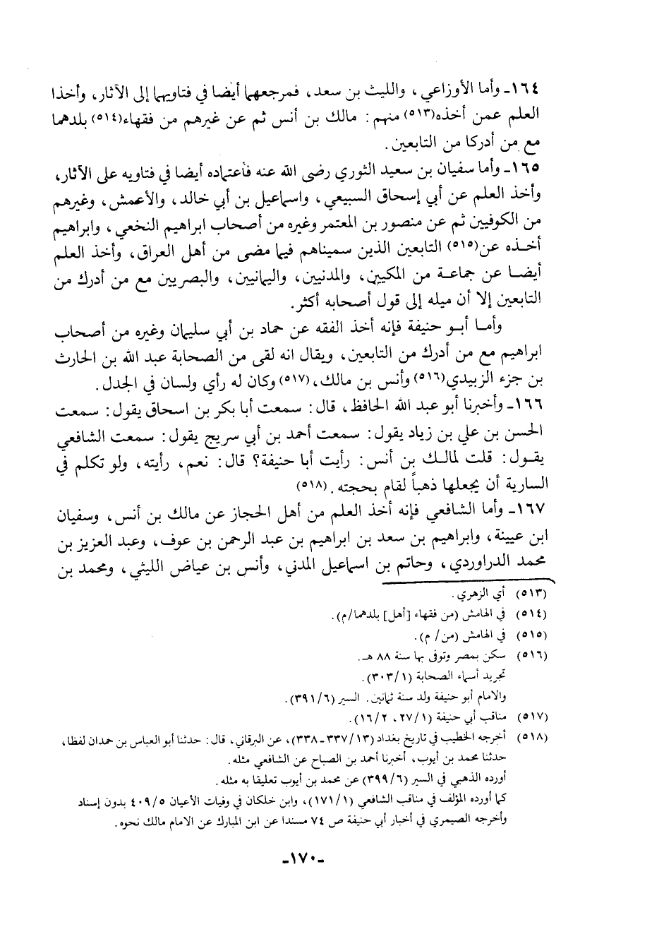 170 - وَأَخَذَ عَنْ جَمَاعَةٍ مِنْ أَهْلِ الْحِجَازِ وَالْعِرَاقِ , عَنْ هِشَامِ بْنِ عُرْوَةَ بْنِ الزُّبَيْرِ وَجَعْفَرِ بْنِ مُحَمَّدِ بْنِ عَلِيِّ بْنِ الْحُسَيْنِ بْنِ عَلِيِّ بْنِ أَبِي طَالِبٍ رَضِيَ اللَّهُ عَنْهُ , وَعُبَيْدِ اللَّهِ بْنِ عُمَرَ بْنِ حَفْصِ بْنِ عَاصِمِ بْنِ عُمَرَ بْنِ الْخَطَّابِ رَضِيَ اللَّهُ عَنْهُ , وَأَخَذَ عَنْ عَبْدِ اللَّهِ بْنِ الْمُبَارَكِ الْخُرَاسَانِيِّ، ثُمَّ عَنْ دَاوُدَ بْنِ عَبْدِ الرَّحْمَنِ الْعَطَّارِ عَنْهُ , ثُمَّ أَخَذَ عَنْ أَصْحَابِ عُبَيْدِ اللَّهِ بْنِ عَمْرٍو الرَّقِّيِّ مِنْ أَهْلِ الْجَزِيرَةِ , وَأَخَذَ عَنْ مُحَمَّدِ بْنِ الْحَسَنِ الشَّيْبَانِيِّ، مِنْ مَذْهَبِهِ وَمَذْهَبِ صَاحِبِهِ مَا احْتَاجَ إِلَيْهِ , حَتَّى وَقَفَ عَلَيْهِ وَعَلَى مَا احْتَجَّا بِهِ , ثُمَّ نَاظَرَهُ فِيمَا كَانَ يَرَى خِلَافَهُ فِيهِ وَكَانَ يَقُولُ: مَا كَلَّمْتُ أَسْوَدَ الرَّأْسِ أَعْقِلَ مِنْ مُحَمَّدِ بْنِ الْحَسَنِ.