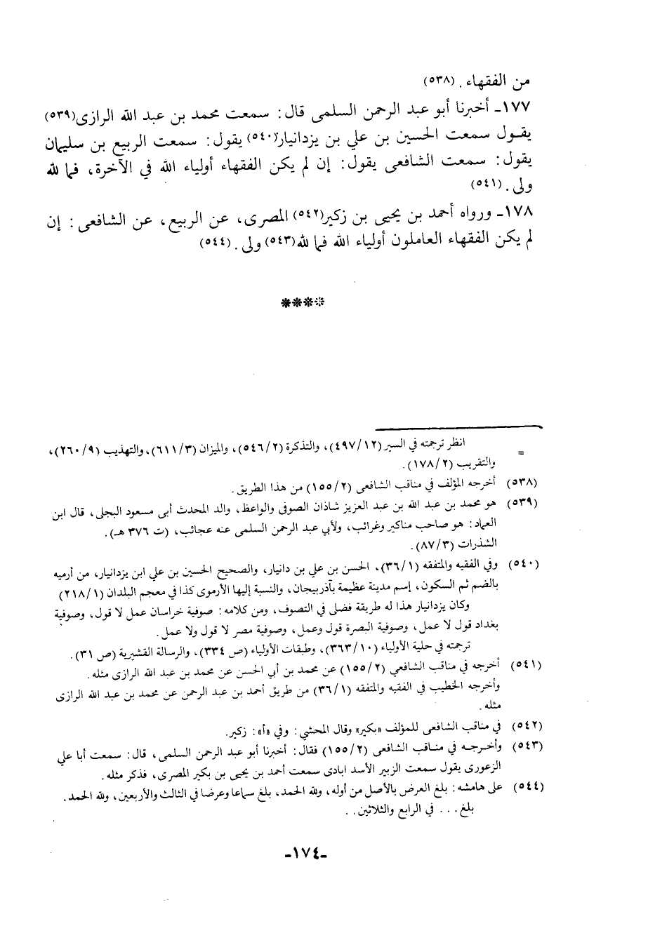 177 - أَخْبَرَنَا أَبُو عَبْدِ الرَّحْمَنِ السُّلَمِيُّ قَالَ: سَمِعْتُ مُحَمَّدَ بْنَ عَبْدِ اللَّهِ الرَّازِيَّ يَقُولُ: سَمِعْتُ الْحُسَيْنَ بْنَ عَلِيِّ بْنِ يُزْدَانِيَارَ يَقُولُ: سَمِعْتُ الرَّبِيعَ بْنَ سُلَيْمَانَ يَقُولُ: سَمِعْتُ الشَّافِعِيَّ يَقُولُ: §إِنْ لَمْ يَكُنِ الْفُقَهَاءُ أَوْلِيَاءَ اللَّهِ فِي الْآخِرَةِ , فَمَا لِلَّهِ وَلِيٌ