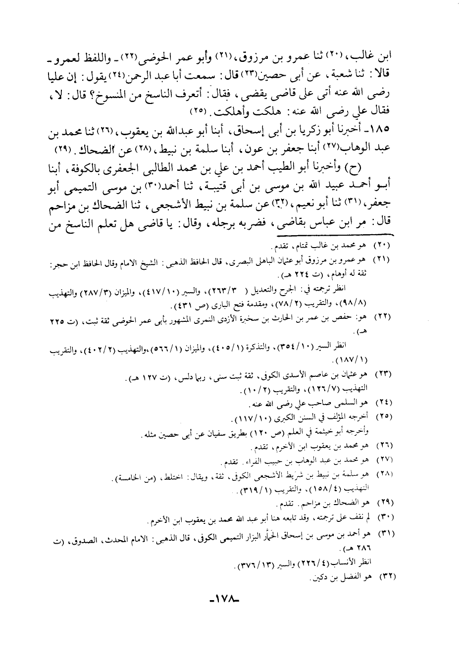 185 - أَخْبَرَنَا أَبُو زَكَرِيَّا بْنُ أَبِي إِسْحَاقَ، أبنا أَبُو عَبْدِ اللَّهِ بْنُ يَعْقُوبَ، ثنا مُحَمَّدُ بْنُ عَبْدِ الْوَهَّابٍ، أبنا جَعْفَرُ بْنُ عَوْنٍ، أبنا سَلَمَةُ بْنُ نُبَيْطٍ، عَنِ الضَّحَّاكِ، ح وَأَخْبَرَنَا أَبُو الطَّيِّبِ أَحْمَدُ بْنُ عَلِيِّ بْنِ مُحَمَّدِ الطَّالِبِيُّ الْجَعْفَرِيُّ بِالْكُوفَةِ , أبنا أَبُو أَحْمَدَ عُبَيْدُ اللَّهِ بْنُ مُوسَى بْنِ أَبِي قُتَيْبَةَ , ثنا أَحْمَدُ بْنُ مُوسَى التَّمِيمِيُّ أَبُو جَعْفَرٍ، ثنا أَبُو نُعَيْمٍ، عَنْ سَلَمَةَ بْنِ نُبَيْطٍ الْأَشْجَعِيِّ، ثنا الضَّحَّاكُ بْنُ مُزَاحِمٍ قَالَ: §مَرَّ ابْنُ عَبَّاسٍ بِقَاضٍ , فَضَرَبَهُ بِرِجْلِهِ , وَقَالَ يَا قَاضٍ , هَلْ تَعْلَمُ النَّاسِخَ مِنَ -[179]- الْمَنْسُوخِ؟ قَالَ: وَمَا النَّاسِخُ مِنَ الْمَنْسُوخِ؟ قَالَ: أَوَلَا تَعْرِفُ؟ قَالَ: لَا , قَالَ: هَلَكْتَ وَأَهْلَكْتَ لَفْظُ حَدِيثِ جَعْفَرٍ