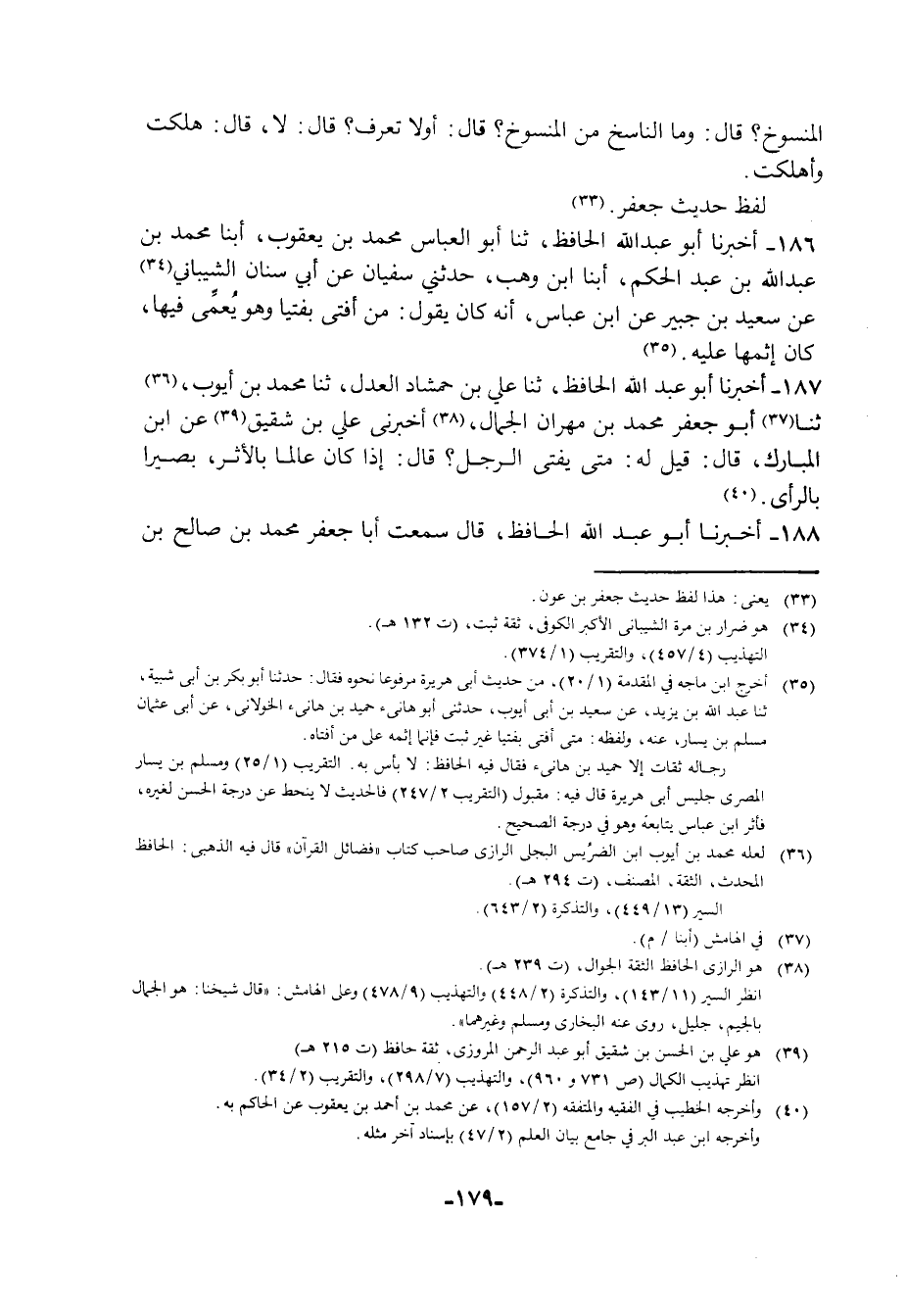 187 - أَخْبَرَنَا أَبُو عَبْدِ اللَّهِ الْحَافِظُ، ثنا عَلِيُّ بْنُ حَمْشَاذٍ الْعَدْلُ، ثنا مُحَمَّدُ بْنُ أَيُّوبَ، ثنا أَبُو جَعْفَرٍ مُحَمَّدُ بْنُ مِهْرَانَ الْجَمَّالُ , أَخْبَرَنِي عَلِيُّ بْنُ شَقِيقٍ، عَنِ ابْنِ الْمُبَارَكِ قَالَ: قِيلَ لَهُ: §مَتَى يُفْتِي الرَّجُلُ؟ قَالَ: إِذَا كَانَ عَالِمًا بِالْأَثَرِ بَصِيرًا بِالرَّأْي