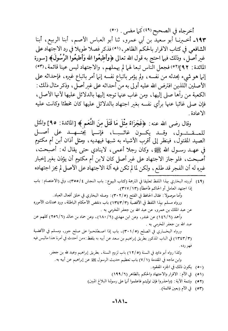 193 - أَخْبَرَنَا أَبُو سَعِيدِ بْنُ أَبِي عَمْرٍو، ثنا أَبُو الْعَبَّاسِ الْأَصَمُّ، أبنا الرَّبِيعُ، أبنا الشَّافِعِيُّ فِي كِتَابِ الْإِقْرَارِ بِالْحُكْمِ الظَّاهِرِ , فَذَكَرَ فَصْلًا طَوِيلًا فِي رَدِّ الِاجْتِهَادِ عَلَى غَيْرِ أَصْلٍ , وَذَلِكَ فِيمَا احْتَجَّ بِهِ , قَوْلُ اللَّهِ تَعَالَى {وَأَطِيعُوا اللَّهَ وَأَطِيعُوا الرَّسُولَ} [المائدة: 92] فَجَعَلَ النَّاسَ تَبَعًا لَهُمَا لَمْ يُهْمِلْهُمْ , وَالِاجْتِهَادُ لَيْسَ عَيْنًا قَائِمَةً , إِنَّمَا هُوَ شَيْءٌ يُحْدِثُهُ مِنْ نَفْسِهِ , وَلَمْ يُؤْمَرْ بِاتِّبَاعِ نَفْسِهِ , إِنَّمَا أُمِرَ بِاتِّبَاعِ غَيْرِهِ , فَإِحْدَاثُهُ عَلَى الْأَصْلَيْنِ اللَّذَيْنِ افْتَرَضَ اللَّهُ عَلَيْهِ أَوْلَى بِهِ مِنْ إِحْدَاثِهِ عَلَى غَيْرِ أَصْلٍ , وَذَكَرَ مِثَالَ ذَلِكَ الْكَعْبَةَ , مَنْ رَآهَا صَلَّى إِلَيْهَا , وَمَنْ غَابَ عَنْهَا تَوَجَّهَ إِلَيْهَا بِالدَّلَائِلِ عَلَيْهَا لِأَنَّهَا الْأَصْلُ , فَإِنْ صَلَّى غَائِبًا عَنْهَا بِرَأْيِ نَفْسِهِ بِغَيْرِ اجْتِهَادٍ بِالدَّلَائِلِ عَلَيْهَا , كَانَ مُخْطِئًا , وَكَانَتْ عَلَيْهِ الْإِعَادَةُ , وَقَالَ رَضِيَ اللَّهُ عَنْهُ: " {فَجَزَاءٌ مِثْلُ مَا قَتَلَ مِنَ النَّعَمِ} [المائدة: 95] وَالْمِثْلُ لِلْمَقْتُولِ , وَقَدْ يَكُونُ غَائِبًا , فَإِنَّمَا يَجْتَهِدُ عَلَى أَصْلِ الصَّيْدِ الْمَقْتُولِ فَيَنْظُرُ إِلَى أَقْرَبِ الْأَشْيَاءِ بِهِ شَبَهًا , فَيُهْدِيهِ , وَمِثْلُ أَذَانِ ابْنِ أُمِّ مَكْتُومٍ فِي عَهْدِ رَسُولِ اللَّهِ صَلَّى اللهُ عَلَيْهِ وَسَلَّمَ , وَكَانَ رَجُلًا أَعْمَى لَا يُنَادِي حَتَّى يُقَالَ لَهُ: أَصْبَحْتَ أَصْبَحْتَ , فَلَوْ جَازَ الِاجْتِهَادُ عَلَى غَيْرِ أَصْلٍ كَانَ لِابْنِ أُمِّ مَكْتُومٍ أَنْ يُؤَذِّنَ بِغَيْرِ إِخْبَارِ غَيْرِهِ لَهُ أَنَّ الْفَجْرَ قَدْ طَلُعَ , وَلَكِنْ لَمَّا لَمْ تَكُنْ فِيهِ آلَةُ الِاجْتِهَادِ عَلَى الْأَصْلِ لَمْ يَجُزِ اجْتِهَادُهُ -[182]- حَتَّى يُخْبِرَهُ مَنْ قَدِ اجْتَهَدَ عَلَى الْأَصْلِ , ثُمَّ سَاقَ الْكَلَامَ إِلَى أَنْ قَالَ: فَإِنْ قِيلَ: فَقَدْ أَمَرَ رَسُولُ اللَّهِ صَلَّى اللهُ عَلَيْهِ وَسَلَّمَ سَعْدًا أَنْ يَحْكُمَ فِي بَنِي قُرَيْظَةَ , فَحَكَمَ بِرَأْيهِ , فَقَالَ رَسُولُ اللَّهِ صَلَّى اللهُ عَلَيْهِ وَسَلَّمَ: «§وَافَقْتَ حُكْمَ اللَّهِ فِيهِمْ» ، قِيلَ هُوَ مِثْلُ قَوْلِ اللَّهِ تَعَالَى {وَشَاوِرْهُمْ فِي الْأَمْرِ} [آل عمران: 159] عَلَى مَعْنَى اسْتِطَابَةِ أَنْفُسِ الْمُسْتَشَارِينِ أَوِ الْمُسْتَشَارِ مِنْهُمْ , وَالرِّضَى بِالصُّلْحِ عَلَىٍ ذَلِكَ , وَوَضْعِ الْحَرْبِ بِذَلِكَ السَّبَبِ , لَا أَنَّ بِرَسُولِ اللَّهِ صَلَّى اللهُ عَلَيْهِ وَسَلَّمَ حَاجَةً إِلَى مَشُورَةِ أَحَدٍ وَاللَّهُ يُؤَيِّدُهُ بِنَصْرِهِ , بَلْ لِلَّهِ وَلِرَسُولِهِ الْمَنُّ وَالطَوْلُ عَلَى جَمِيعِ خَلْقِهِ. فَيُحْتَمَلُ أَنْ يَكُونَ قَوْلُهُ لَهُ «احْكُمْ» عَلَى هَذَا الْمَعْنَى. أَوْ يَكُونَ قَدْ عَلِمَ مِنْ رَسُولِ اللَّهِ صَلَّى اللهُ عَلَيْهِ وَسَلَّمَ سُنَّةً فِي مِثْلِ هَذَا , فَحَكَمَ عَلَى مِثْلِهَا , أَوْ يَحْكُمُ فَيُوَفِّقُهُ اللَّهُ لِأَمْرِ رَسُولِ اللَّهِ صَلَّى اللهُ عَلَيْهِ وَسَلَّمَ فَيَعْرِفُ رَسُولُ اللَّهِ صَلَّى اللهُ عَلَيْهِ وَسَلَّمَ صَوَابَ ذَلِكَ , فَيُقِرُّهُ عَلَيْهِ , أَوْ يَعْرِفُ غَيْرَ ذَلِكَ , فَيعْمَلُ رَسُولُ اللَّهِ صَلَّى اللهُ عَلَيْهِ وَسَلَّمَ فِي ذَلِكَ بِطَاعَةِ اللَّهِ. قَالَ: فَإِنْ قِيلَ: فَقَدْ أَكَلُوا الْحُوتَ بِغَيْرِ حُضُورِ النَّبِيِّ صَلَّى اللهُ عَلَيْهِ وَسَلَّمَ , بِلَا أَصْلٍ عِنْدَهُمْ، يَعْنِي أَصْحَابَ أَبِي عُبَيْدَةَ , قِيلَ: لِمَوْضِعِ الضَّرُورَةِ وَالْحَاجَةِ إِلَى أَكْلِ