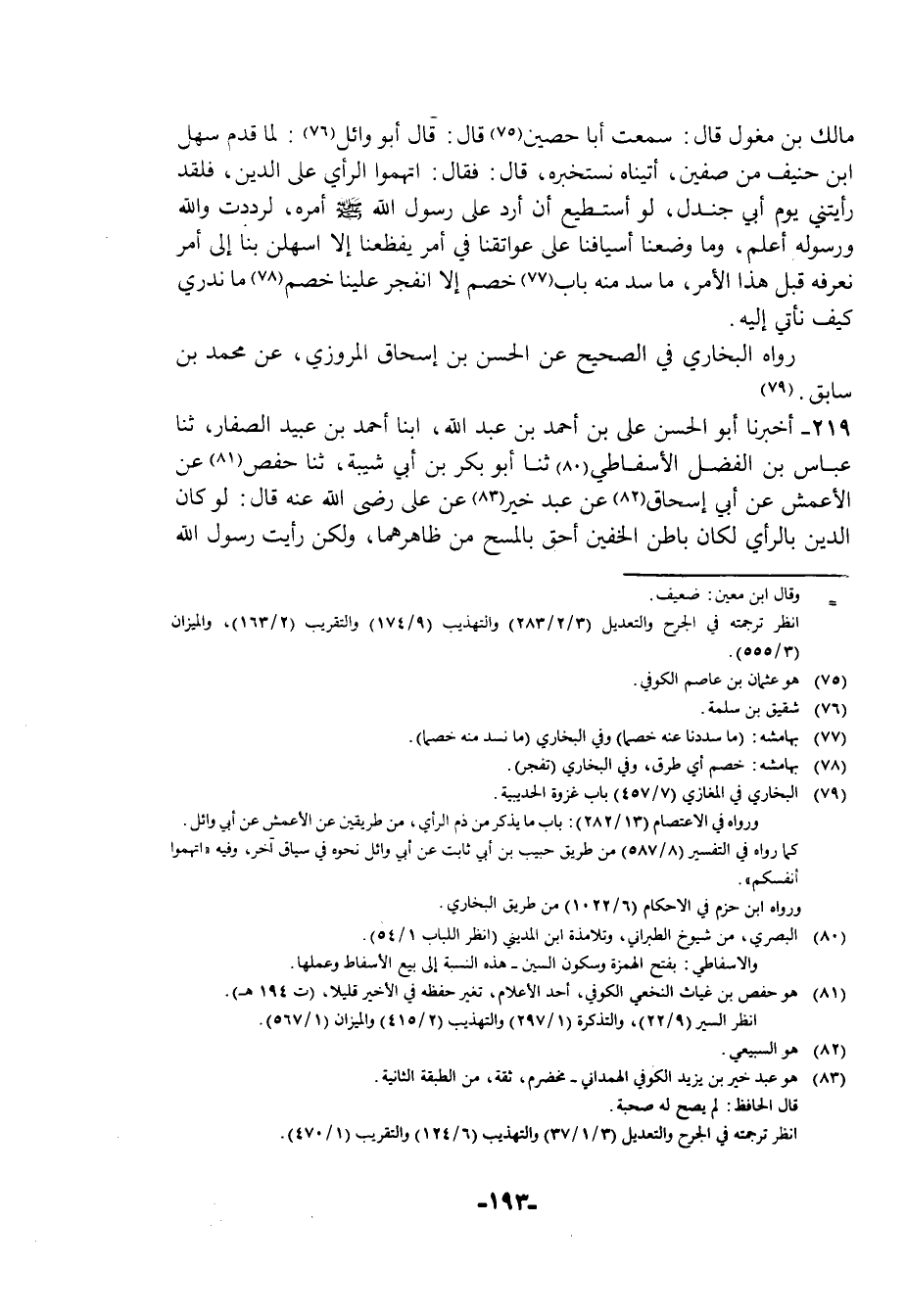 219 - أَخْبَرَنَا أَبُو الْحَسَنِ عَلِيُّ بْنُ أَحْمَدَ بْنِ عَبْدِ اللَّهِ , أبنا أَحْمَدُ بْنُ عُبَيْدٍ الصَّفَّارُ، ثنا عَبَّاسُ بْنُ الْفَضْلِ الْأَسْفَاطِيُّ، ثنا أَبُو بَكْرِ بْنُ أَبِي شَيْبَةَ، ثنا حَفْصٌ، عَنِ الْأَعْمَشِ، عَنْ أَبِي إِسْحَاقَ، عَنْ عَبْدِ خَيْرٍ، عَنْ عَلِيٍّ رَضِيَ اللَّهُ عَنْهُ قَالَ: §لَوْ كَانَ الدِّينُ بِالرَّأْي لَكَانَ بَاطِنُ الْخُفَّيْنِ أَحَقُّ بِالْمَسْحِ مِنْ ظَاهِرِهِمَا , وَلَكِنْ رَأَيْتُ رَسُولَ اللَّهِ صَلَّى اللهُ عَلَيْهِ وَسَلَّمَ يَمْسَحُ عَلَى ظَاهِرِهِمَا