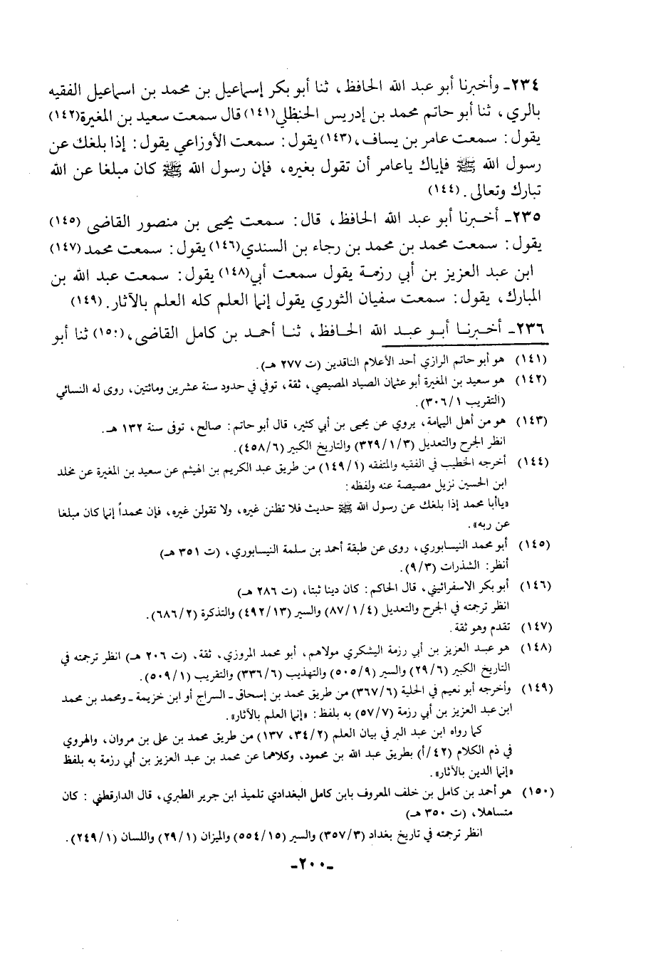 235 - أَخْبَرَنَا أَبُو عَبْدِ اللَّهِ الْحَافِظُ قَالَ: سَمِعْتُ يَحْيَى بْنَ مَنْصُورٍ الْقَاضِي يَقُولُ سَمِعْتُ مُحَمَّدَ بْنَ مُحَمَّدِ بْنِ رَجَاءِ بْنِ السَّنَدِيِّ يَقُولُ: سَمِعْتُ مُحَمَّدَ بْنَ عَبْدِ الْعَزِيزِ بْنِ أَبِي رِزْمَةَ يَقُولُ: سَمِعْتُ أَبِي يَقُولُ: سَمِعْتُ عَبْدَ اللَّهِ بْنَ الْمُبَارَكِ يَقُولُ: سَمِعْتُ سُفْيَانَ الثَّوْرِيَّ يَقُولُ: §إِنَّمَا الْعِلْمُ كُلَّهُ الْعِلْمُ بِالْآثَارِ