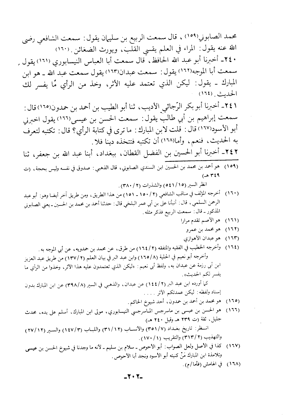 240 - أَخْبَرَنَا أَبُو عَبْدِ اللَّهِ الْحَافِظُ قَالَ: سَمِعْتُ أَبَا الْعَبَّاسِ النَّيْسَابُورِيَّ يَقُولُ: سَمِعْتُ أَبَا الْمُوَجِّهِ يَقُولُ: سَمِعْتُ عَبْدَانَ يَقُولُ: سَمِعْتُ عَبْدَ اللَّهِ هُوَ ابْنُ الْمُبَارَكِ يَقُولُ: §لِيَكُنِ الَّذِي تَعْتَمِدُ عَلَيْهِ الْأَثَرُ وَخُذْ مِنَ الرَّأْي مَا يُفَسِّرُ لَكَ الْحَدِيثَ