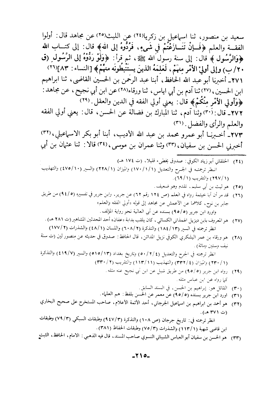 271 - أَخْبَرَنَا أَبُو عَبْدِ اللَّهِ الْحَافِظُ، أبنا عَبْدُ الرَّحْمَنِ بْنُ الْحُسَيْنِ الْقَاضِي، ثنا إِبْرَاهِيمُ بْنُ الْحُسَيْنِ، ثنا آدَمُ بْنُ أَبِي إِيَاسٍ، ثنا وَرْقَاءُ، عَنِ ابْنِ أَبِي نَجِيحٍ، عَنْ مُجَاهِدٍ: {§وَأُولِي الْأَمْرِ مِنْكُمْ} [النساء: 59] قَالَ: يَعْنِي أُولِي الْفِقْهِ فِي الدِّينِ وَالْعَقْلِ
