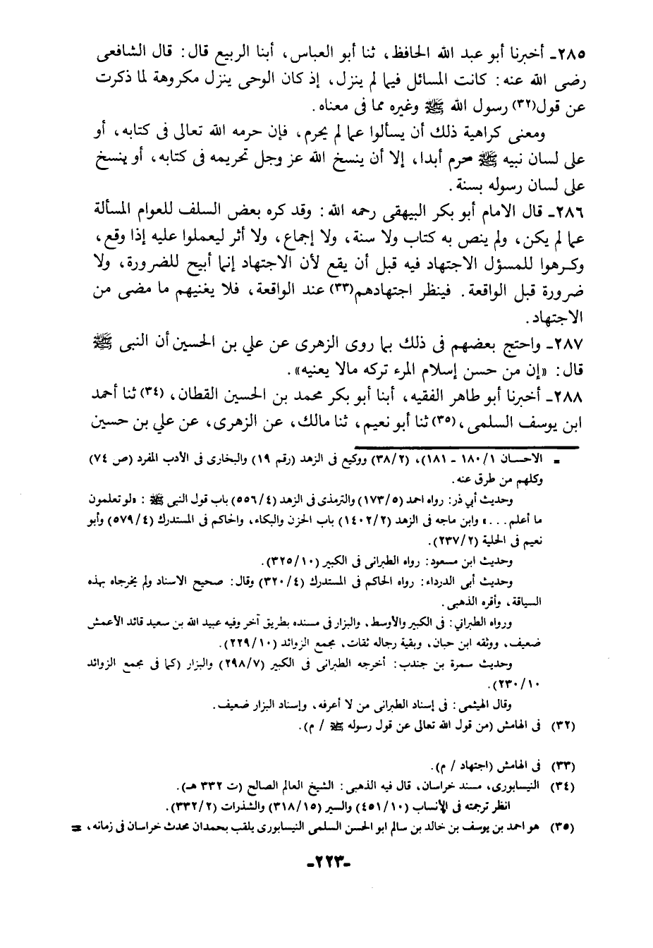 286 - قَالَ الْإِمَامُ أَبُو بَكْرٍ الْبَيْهَقِيُّ رَحِمَهُ اللَّهُ: وَقَدْ كَرِهَ بَعْضُ السَّلَفِ لِلْعَوَامِّ الْمَسْأَلَةَ عَمَّا لَمْ يَكُنْ , وَلَمْ يَنُصَّ بِهِ كِتَابٌ وَلَا سُنَّةٌ وَلَا إِجْمَاعٌ , وَلَا أَثَرٌ , لِيعْمَلُوا عَلَيْهِ إِذَا وَقَعَ , وَكَرِهُوا لِلْمَسْؤُولِ الِاجْتِهَادَ فِيهِ قَبْلَ أَنْ يَقَعَ , لِأَنَّ الِاجْتِهَادَ إِنَّمَا أُبِيحَ لِلضَّرُورَةِ , وَلَا ضَرُورَةَ قَبْلَ الْوَاقِعَةِ , فَيُنْظَرُ اجْتِهَادُهُمْ عِنْدَ الْوَاقِعَةِ , فَلَا يُغَنِّيهِمْ مَا مَضَى مِنَ الِاجْتِهَادِ