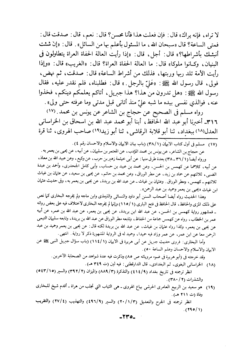 316 - أَخْبَرَنَا أَبُو عَبْدِ اللَّهِ الْحَافِظُ، أبنا أَبُو مُحَمَّدٍ عَبْدُ اللَّهِ بْنُ إِسْحَاقَ بْنِ الْخُرَاسَانِيِّ الْعَدْلُ بِبَغْدَادَ , ثنا أَبُو قِلَابَةَ الرَّقَاشِيُّ، ثنا أَبُو زَيْدٍ صَاحِبُ الْهَرَوِيِّ , ثنا قُرَّةُ -[236]- بْنُ خَالِدٍ، عَنْ أَبِي جَمْرَةَ الضُّبَعِيَّ نَصْرَ بْنِ عِمْرَانَ قَالَ: قُلْتُ لِابْنِ عَبَّاسٍ: إِنَّ لِي جَرَّةَ نَبِيذٍ , لِي فِيهَا نَبِيذٌ حُلْوٌ , فَإِنْ شَرِبْتُ مِنْهُ فَأَطَلْتُ مُجَالَسَةَ الْقَوْمِ , خَشِيتُ أَنْ أُفْتَضَحَ , فَقَالَ ابْنُ عَبَّاسٍ: جَاءَ وَفْدُ عَبْدِ الْقَيْسِ إِلَى النَّبِيِّ صَلَّى اللهُ عَلَيْهِ وَسَلَّمَ فَقَالَ: «§مَرْحَبًا بِالْوَفْدِ غَيْرَ الْخَزَايَا وَلَا النَّدَامَى» قَالُوا: يَا رَسُولَ اللَّهِ , إِنَّ بَيْنَنَا وَبَيْنَكَ كُفَّارُ مُضَرَ , وَإِنَّا لَا نَصِلُ إِلَيْكَ إِلَّا فِي الشَّهْرِ الْحَرَامِ , فَمُرْنَا بِأَمْرٍ إِذَا عَمِلْنَاهُ دَخَلْنَا الْجَنَّةَ وَنَدْعُو إِلَيْهِ مَنْ وَرَاءَنَا قَالَ: فَقَالَ: " آمُرُكُمْ بِالْإِيمَانِ , تَدْرُونَ مَا الْإِيمَانُ؟ شَهَادَةُ أَنْ لَا إِلَهَ إِلَّا اللَّهُ وَحْدَهُ لَا شَرِيكَ لَهُ , وَتُقِيمُوا الصَّلَاةَ , وَتُؤْتُوا الزَّكَاةَ , وَتَصُومُوا رَمَضَانَ , وَتَحُجُّوا الْبَيْتَ وَأَحْسَبُهُ قَالَ: وَتُؤَدُّوا الْخُمُسَ مِنَ الْمَغَانِمِ وَأَنْهَاكُمْ عَنْ أَرْبَعٍ: عَنِ الْجَرِّ , وَالدُّبَّاءِ , وَالنَّقِيرِ , وَالْمُزَفَّتِ " أَخْرَجَهُ الْبُخَارِيُّ وَمُسْلِمٌ فِي الصَّحِيحِ مِنْ حَدِيثِ قُرَّةَ بْنِ خَالِدٍ.