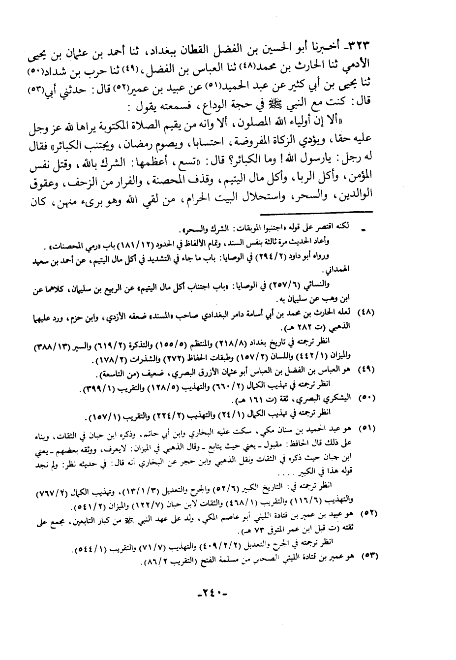 323 - أَخْبَرَنَا أَبُو الْحُسَيْنِ بْنُ الْفَضْلِ الْقَطَّانُ بِبَغْدَادَ , ثنا أَحْمَدُ بْنُ عُثْمَانَ بْنِ يَحْيَى الْأَدَمِيُّ، ثنا الْحَارِثُ بْنُ مُحَمَّدٍ، ثنا الْعَبَّاسُ بْنُ الْفَضْلِ، ثنا حَرْبُ بْنُ شَدَّادٍ، ثنا يَحْيَى بْنُ أَبِي كَثِيرٍ، عَنْ عَبْدِ الْحَمِيدِ، عَنْ عُبَيْدِ بْنِ عُمَيْرٍ قَالَ: حَدَّثَنِي أَبِي قَالَ: كُنْتُ مَعَ النَّبِيِّ صَلَّى اللهُ عَلَيْهِ وَسَلَّمَ فِي حَجَّةِ الْوَدَاعِ , فَسَمِعْتُهُ يَقُولُ: §«أَلَا إِنَّ أَوْلِيَاءَ اللَّهِ الْمُصَلُّونَ , أَلَّا وَإِنَّهُ مِنْ يُقِيمُ الصَّلَاةَ الْمَكْتُوبَةَ يَرَاهَا لِلَّهِ عَزَّ وَجَلَّ عَلَيْهِ حَقًّا , وَيُؤَدِّي الزَّكَاةَ الْمَفْرُوضَةَ احْتِسَابًا , وَيصُومُ رَمَضَانَ , وَيجْتَنِبُ الْكَبَائِرَ» ، فَقَالَ لَهُ رَجُلٌ: يَا رَسُولَ اللَّهِ , وَمَا الْكَبَائِرُ؟ قَالَ: " تِسْعٌ: أَعْظَمُهَا الشِّرْكُ بِاللَّهِ , وَقَتْلُ نَفْسِ الْمُؤْمِنِ , وَأَكَلُ الرِّبَا , وَأَكَلُ مَالِ الْيتِيمِ , وَقَذْفُ الْمُحْصَنَةِ , وَالْفِرَارُ مِنَ الزَّحْفِ , وَعُقُوقُ الْوَالِدَيْنِ , وَالسِّحْرُ , وَاسْتِحْلَالُ الْبَيْتِ الْحَرَامِ , مَنْ لَقِيَ اللَّهَ وَهُوَ بَرِيءٌ مِنْهُنَّ كَانَ -[241]- مَعِي فِي جُنَّةٍ مَصَارِيعُهَا مِنْ ذَهَبٍ "