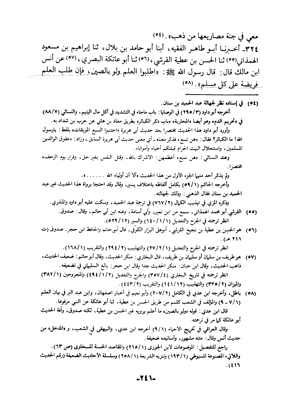 325 - أَخْبَرَنَا أَبُو طَاهِرٍ الْفَقِيهُ، أبنا أَبُو حَامِدِ بْنُ بِلَالٍ، ثنا إِبْرَاهِيمُ بْنُ مَسْعُودٍ الْهَمَذَانِيُّ، ثنا الْحَسَنُ بْنُ عَطِيَّةَ الْقُرَشِيُّ، ثنا أَبُو عَاتِكَةَ الْبَصْرِيُّ، عَنْ أَنَسِ بْنِ مَالِكٍ قَالَ: قَالَ رَسُولُ اللَّهِ صَلَّى اللهُ عَلَيْهِ وَسَلَّمَ: §«اطْلُبُوا الْعِلْمَ وَلَوْ بِالصِّينِ , فَإِنَّ طَلَبَ الْعِلْمِ فَرِيضَةٌ عَلَى كُلِّ مُسْلِمٍ» هَذَا حَدِيثٌ مَتْنُهُ مَشْهُورٌ , وَأَسَانِيدُهُ ضَعِيفَةٌ , لَا أَعْرِفُ لَهُ إِسْنَادًا يَثْبُتُ بِمِثْلِهِ الْحَدِيثُ وَاللَّهُ أَعْلَمُ