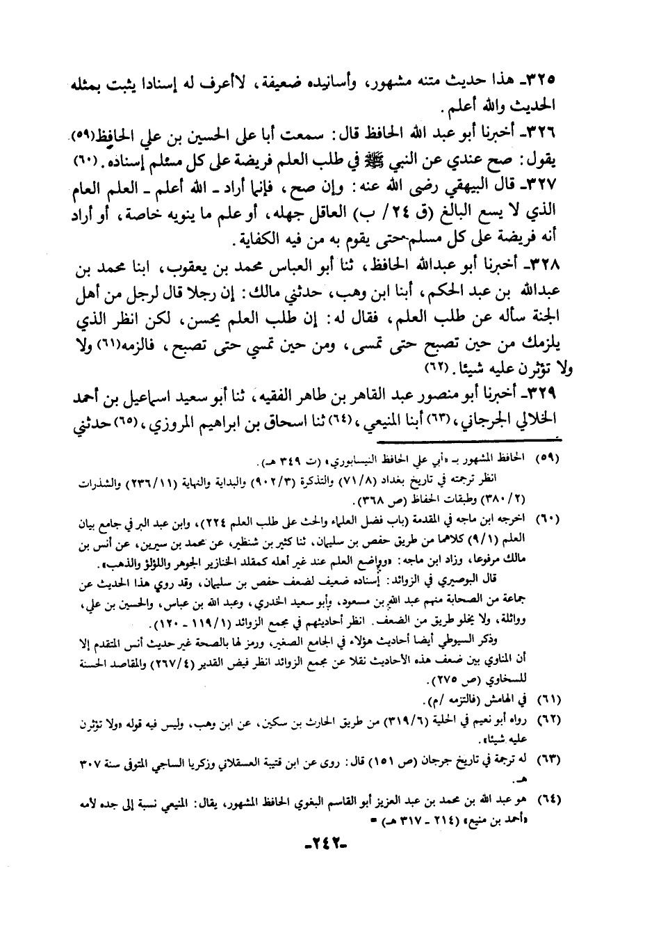 326 - أَخْبَرَنَا أَبُو عَبْدِ اللَّهِ الْحَافِظُ قَالَ: سَمِعْتُ أَبَا عَلِيٍّ الْحُسَيْنَ بْنَ عَلِيٍّ الْحَافِظَ يَقُولُ: صَحَّ عِنْدِي عَنِ النَّبِيِّ صَلَّى اللهُ عَلَيْهِ وَسَلَّمَ فِي §«طَلَبُ الْعِلْمِ فَرِيضَةٌ عَلَى كُلِّ مُسْلِمٍ» إِسْنَادُهُ