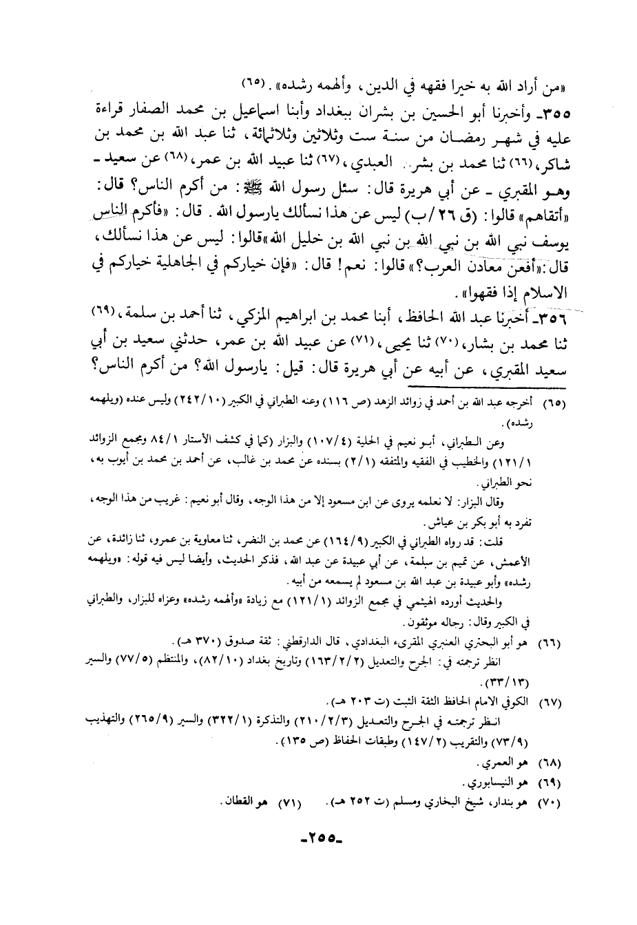 355 - وَأَخْبَرَنَا أَبُو الْحُسَيْنِ بْنُ بِشْرَانَ بِبَغْدَادَ , وَأَبْنَا إِسْمَاعِيلُ بْنُ مُحَمَّدٍ الصَّفَّارُ، قِرَاءَةً عَلَيْهِ فِي شَهْرِ رَمَضَانَ مِنْ سَنَةِ سِتٍّ وَثَلَاثِينَ وَثَلَاثِمِائَةَ , ثنا عَبْدُ اللَّهِ بْنُ مُحَمَّدِ بْنِ شَاكِرٍ , ثنا مُحَمَّدُ بْنُ بِشْرٍ الْعَبْدِيُّ , ثنا عُبَيْدُ اللَّهِ بْنُ عُمَرَ , عَنْ سَعِيدٍ وَهُوَ الْمَقْبُرِيُّ , عَنْ أَبِي هُرَيْرَةَ قَالَ: سُئِلَ رَسُولُ اللَّهِ صَلَّى اللهُ عَلَيْهِ وَسَلَّمَ: مَنْ أَكْرَمُ النَّاسِ؟ قَالَ: «أَتْقَاهُمْ» قَالُوا: لَيْسَ عَنْ هَذَا نَسْأَلُكَ يَا رَسُولَ اللَّهِ قَالَ: «فَأَكْرَمُ النَّاسِ يُوسُفُ نَبِيُّ اللَّهِ بْنُ نَبِيِّ اللَّهِ بْنِ نَبِيِّ اللَّهِ بْنِ خَلِيلِ اللَّهِ» قَالُوا: لَيْسَ عَنْ هَذَا نَسْأَلُكَ. قَالَ: «أَفَعَنْ مَعَادِنِ الْعَرَبِ؟» قَالُوا: نَعَمْ , قَالَ: §«فَإِنَّ خِيَارَكُمْ فِي الْجَاهِلِيَّةِ خِيَارُكُمْ فِي الْإِسْلَامِ إِذَا فَقِهُوا»