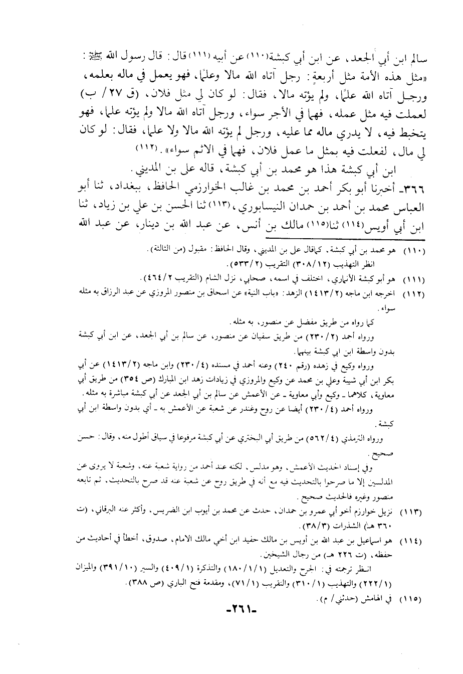 366 - أَخْبَرَنَا أَبُو بَكْرٍ أَحْمَدُ بْنُ مُحَمَّدِ بْنِ غَالِبٍ الْخُوَارِزْمِيُّ الْحَافِظُ بِبَغْدَادَ , ثنا أَبُو الْعَبَّاسِ مُحَمَّدُ بْنُ أَحْمَدَ بْنِ حَمْدَانَ النَّيْسَابُورِيُّ , ثنا الْحَسَنُ بْنُ عَلِيِّ بْنِ زِيَادٍ، ثنا ابْنُ أَبِي أُوَيْسٍ، ثنا مَالِكُ بْنُ أَنَسٍ، عَنْ عَبْدِ اللَّهِ بْنِ دِينَارٍ، عَنْ عَبْدِ اللَّهِ -[262]- بْنِ عُمَرَ أَنَّ رَسُولَ اللَّهِ صَلَّى اللهُ عَلَيْهِ وَسَلَّمَ قَالَ: §«إِنَّ مِنَ الشَّجَرِ شَجَرَةٌ لَا تُسْقِطُ وَرَقَهَا وَهِيَ مِثْلُ الْمُسْلِمِ , فَحَدِّثُونِي مَا هِيَ؟» فَوَقَعَ النَّاسُ فِي شَجَرِ الْبَادِيةِ , وَوَقَعَ فِي نَفْسِي أَنَّهَا النَّخْلَةُ , فَحَدَّثْتُ أَبِي مَا وَقَعَ فِي نَفْسِي فَقَالَ: لِأَنْ تَكُونَ قُلْتَهَا أَحَبُّ إِلَيَّ مِنْ كَذَا وَكَذَا رَوَاهُ الْبُخَارِيُّ فِي الصَّحِيحِ عَنْ إِسْمَاعِيلَ , وَأَخْرَجَهُ مُسْلِمٌ مِنْ وَجْهٍ آخَرَ