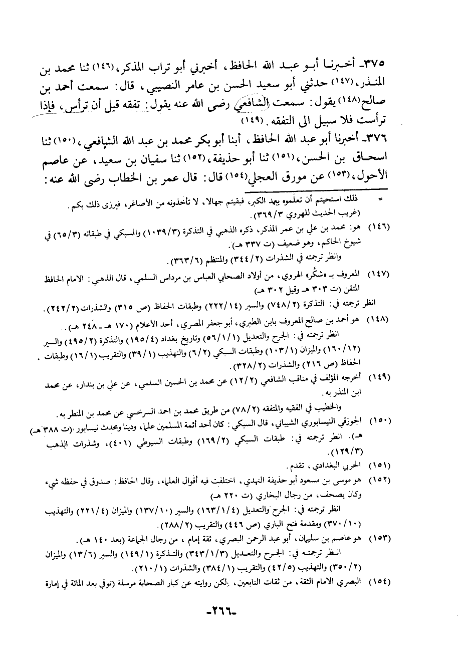 375 - أَخْبَرَنَا أَبُو عَبْدِ اللَّهِ الْحَافِظُ، أَخْبَرَنِي أَبُو تُرَابٍ الْمُذَكِّرُ، ثنا مُحَمَّدُ بْنُ الْمُنْذِرِ، حَدَّثَنِي أَبُو سَعِيدٍ الْحَسَنُ بْنُ عَامِرٍ النَّصِيبِيُّ قَالَ: سَمِعْتُ أَحْمَدَ بْنَ صَالِحٍ يَقُولُ: سَمِعْتُ الشَّافِعِيَّ رَضِيَ اللَّهُ عَنْهُ يَقُولُ: §تَفَقَّهْ قَبْلَ أَنْ تَرَأَّسَ , فَإِذَا تَرَأَّسْتَ فَلَا سَبِيلَ إِلَى التَّفَقُّهِ