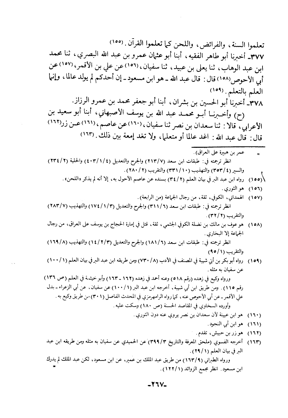 377 - أَخْبَرَنَا أَبُو طَاهِرٍ الْفَقِيهُ، أبنا أَبُو عُثْمَانَ عَمْرُو بْنُ عَبْدِ اللَّهِ الْبَصْرِيُّ , ثنا مُحَمَّدُ بْنُ عَبْدِ الْوَهَّابِ، ثنا يَعْلَى بْنُ عُبَيْدٍ، ثنا سُفْيَانُ، عَنْ عَلِيِّ بْنِ الْأَقْمَرِ، عَنْ أَبِي الْأَحْوَصِ، قَالَ: قَالَ عَبْدُ اللَّهِ هُوَ ابْنُ مَسْعُودٍ: §«إِنَّ أَحَدَكُمْ لَمْ يُولَدْ عَالِمًا , وَإِنَّمَا الْعِلْمُ بِالتَّعَلُّمِ»