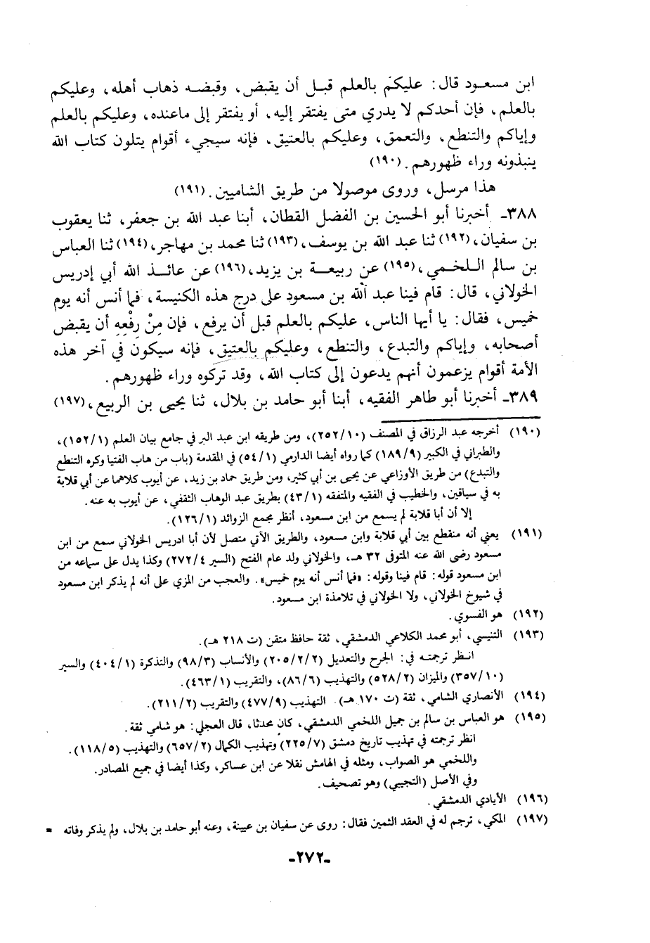 388 - أَخْبَرَنَا أَبُو الْحُسَيْنِ بْنُ الْفَضْلِ الْقَطَّانُ، أبنا عَبْدُ اللَّهِ بْنُ جَعْفَرٍ، ثنا يَعْقُوبُ بْنُ سُفْيَانَ، ثنا عَبْدُ اللَّهِ بْنُ يُوسُفَ، ثنا مُحَمَّدُ بْنُ مُهَاجِرٍ، ثنا الْعَبَّاسُ بْنُ سَالِمٍ اللَّخْمِيُّ، عَنْ رَبِيعَةَ بْنِ يَزِيدَ، عَنْ عَائِذِ اللَّهِ أَبِي إِدْرِيسَ الْخَوْلَانِيِّ قَالَ: قَامَ فِينَا عَبْدُ اللَّهِ بْنُ مَسْعُودٍ عَلَى دَرَجِ هَذِهِ الْكَنِيسَةِ فَمَا أَنْسَى أَنَّهُ يَوْمَ خَمِيسٍ فَقَالَ: §«يَا أَيُّهَا النَّاسُ , عَلَيْكُمْ بِالْعِلْمِ قَبْلَ أَنْ يُرْفَعَ فَإِنَّ مِنْ رَفْعِهِ أَنْ يُقْبَضَ أَصْحَابُهُ , وَإِيَّاكُمْ وَالتَّبَدُّعُ وَالتَّنَطُّعُ , وَعَلَيْكُمْ بِالْعَتِيقِ , فَإِنَّهُ سَيكُونُ فِي آخِرِ هَذِهِ الْأُمَّةِ أَقْوَامٌ يَزْعُمُونَ أَنَّهُمْ يَدْعُونَ إِلَى كِتَابِ اللَّهِ , وَقَدْ تَرَكُوهُ وَرَاءَ ظُهُورِهِمْ»
