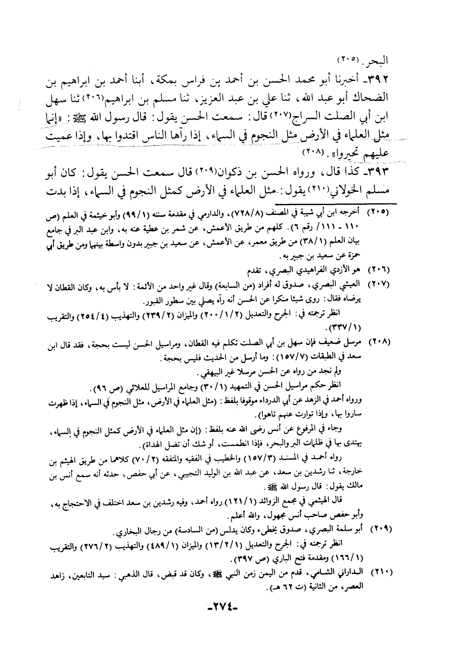 392 - أَخْبَرَنَا أَبُو مُحَمَّدٍ الْحَسَنُ بْنُ أَحْمَدَ بْنِ فِرَاسٍ بِمَكَّةَ , أبنا أَحْمَدُ بْنُ إِبْرَاهِيمَ بْنِ الضَّحَّاكِ أَبُو عَبْدِ اللَّهِ، ثنا عَلِيُّ بْنُ عَبْدِ الْعَزِيزِ، , ثنا مُسْلِمُ بْنُ إِبْرَاهِيمَ، ثنا سَهْلُ بْنُ أَبِي الصَّلْتِ السَّرَّاجُ قَالَ: سَمِعْتُ الْحَسَنَ يَقُولُ: قَالَ رَسُولُ اللَّهِ صَلَّى اللهُ عَلَيْهِ وَسَلَّمَ: §«إِنَّمَا مَثَلُ الْعُلَمَاءِ فِي الْأَرْضِ مِثْلُ النُّجُومِ فِي السَّمَاءِ , إِذَا رَآهَا النَّاسُ اقْتَدُوا بِهَا , وَإِذَا عُمِّيَتْ عَلَيْهِمْ تَحَيَّرُوا»