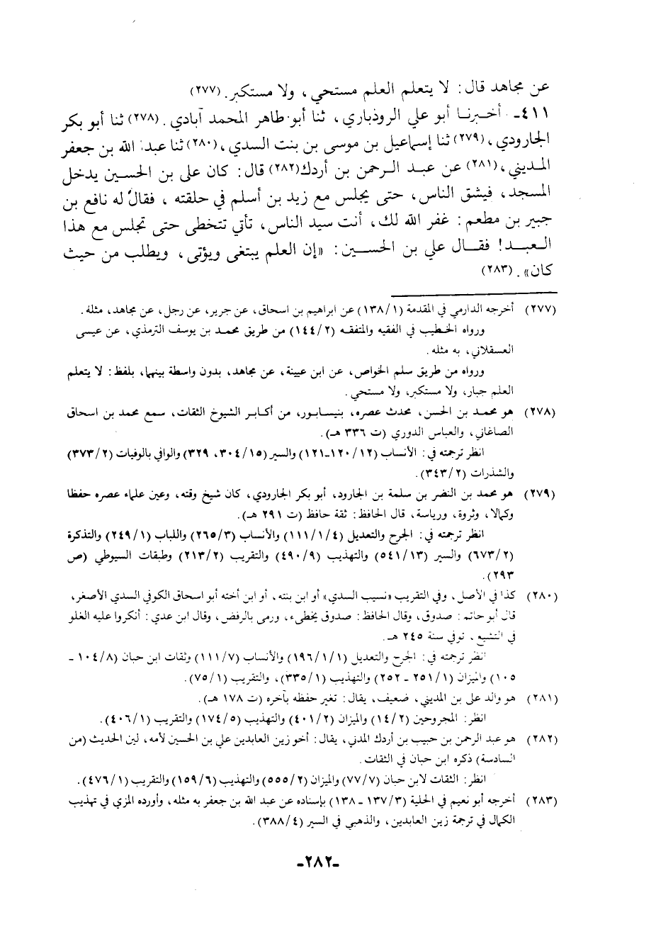 411 - أَخْبَرَنَا أَبُو عَلِيٍّ الرُّوذْبَارِيُّ، ثنا أَبُو طَاهِرٍ الْمُحَمَّدْ آبَادِيُّ , ثنا أَبُو بَكْرٍ الْجَارُودِيُّ، ثنا إِسْمَاعِيلُ بْنُ مُوسَى بْنِ بِنْتِ السُّدِّيِّ، ثنا عَبْدُ اللَّهِ بْنُ جَعْفَرٍ الْمَدِينِيُّ، عَنْ عَبْدِ الرَّحْمَنِ بْنِ أَرْدَكَ قَالَ: كَانَ عَلِيُّ بْنُ الْحُسَيْنِ يدْخُلُ الْمَسْجِدَ فَيشُقُّ النَّاسَ حَتَّى يَجْلِسَ مَعَ زَيْدِ بْنِ أَسْلَمَ فِي حَلْقَتِهِ , فَقَالَ لَهُ نَافِعُ بْنُ جُبَيْرِ بْنِ مُطْعِمٍ: غَفَرَ اللَّهُ لَكَ , أَنْتَ سَيِّدُ النَّاسِ تَأْتِي تَتَخَطَّى حَتَّى تَجْلِسَ مَعَ هَذَا الْعَبْدِ فَقَالَ عَلِيُّ بْنُ الْحُسَيْنِ: §«إِنَّ الْعِلْمَ يُبْتَغَى وَيُؤْتَى وَيُطْلُبُ مِنْ حَيْثُ كَانَ» قَالَ إِسْمَاعِيلُ: عَبْدُ الرَّحْمَنِ بْنُ أَرْدَكَ أَخُو عَلِيِّ بْنِ الْحُسَيْنِ رَضِيَ اللَّهُ عَنْهُمَا لِأُمِّهِ