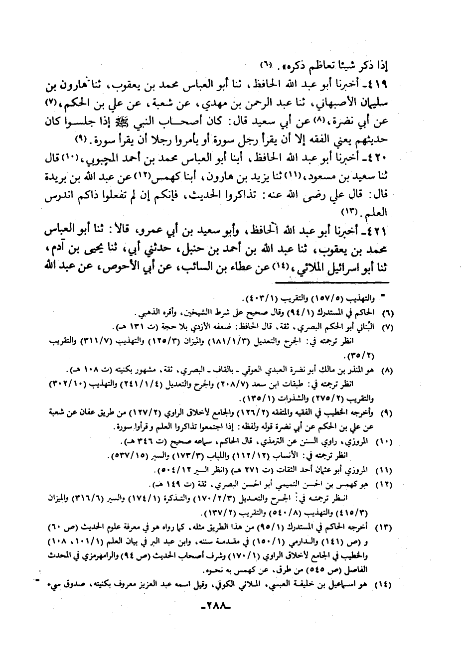 419 - أَخْبَرَنَا أَبُو عَبْدِ اللَّهِ الْحَافِظُ، ثنا أَبُو الْعَبَّاسِ مُحَمَّدُ بْنُ يَعْقُوبَ، ثنا هَارُونُ بْنُ سُلَيْمَانَ الْأَصْبَهَانِيُّ، ثنا عَبْدُ الرَّحْمَنِ بْنُ مَهْدِيٍّ، عَنْ شُعْبَةَ، عَنْ عَلِيِّ بْنِ الْحَكَمِ، عَنْ أَبِي نَضْرَةَ، عَنْ أَبِي سَعِيدٍ، قَالَ: كَانَ أَصْحَابُ النَّبِيِّ صَلَّى اللهُ عَلَيْهِ وَسَلَّمَ §إِذَا جَلَسُوا كَانَ حَدِيثُهُمْ يَعْنِي الْفِقْهَ، إِلَّا أَنْ يَقْرَأَ رَجُلٌ سُورَةً أَوْ يَأْمُرُوا رَجُلًا أَنْ يَقْرَأَ سُورَةً
