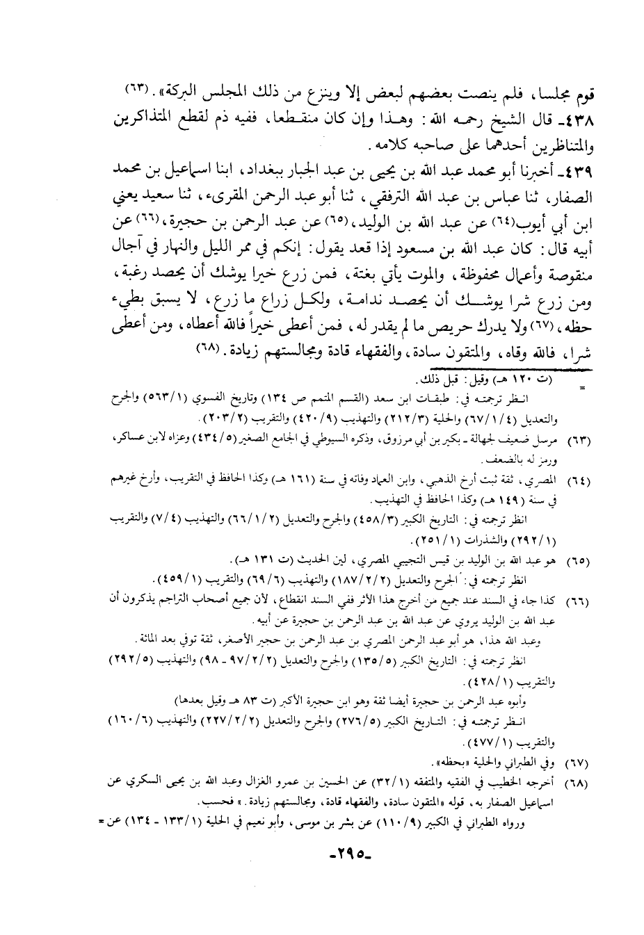 439 - أَخْبَرَنَا أَبُو مُحَمَّدٍ عَبْدُ اللَّهِ بْنُ يَحْيَى بْنِ عَبْدِ الْجَبَّارِ، بِبَغْدَادَ أبنا إِسْمَاعِيلُ بْنُ مُحَمَّدٍ الصَّفَّارُ، ثنا عَبَّاسُ بْنُ عَبْدِ اللَّهِ التَّرْفَقِيُّ، ثنا أَبُو عَبْدِ الرَّحْمَنِ الْمُقْرِئُ، ثنا سَعِيدٌ يَعْنِي ابْنَ أَبِي أَيُّوبَ، عَنْ عَبْدِ اللَّهِ بْنِ الْوَلِيدِ، عَنْ عَبْدِ الرَّحْمَنِ بْنِ حُجَيْرَةَ، عَنْ أَبِيهِ، قَالَ: كَانَ عَبْدُ اللَّهِ بْنُ مَسْعُودٍ إِذَا قَعَدَ يَقُولُ: §إِنَّكُمْ فِي مَمَرِّ اللَّيْلِ وَالنَّهَارِ فِي آجَالٍ مَنْقُوصَةٍ وَأَعْمَالٍ مَحْفُوظَةٍ، وَالْمَوْتُ يَأْتِي بَغْتَةً فَمَنْ زَرْعَ خَيْرًا يُوشِكْ أَنْ يَحْصُدَ رَغْبَةً، وَمَنْ زَرَعَ شَرًّا يُوشِكْ أَنْ يَحْصُدَ نَدَامَةً، وَلِكُلِّ زَارِعٍ مَا زَرَعَ، لَا يَسْبِقُ بَطِيءٌ حَظَّهُ، وَلَا يُدْرِكُ حَرِيصٌ مَا لَمْ يُقَدَّرْ لَهُ، فَمَنْ أُعْطِيَ خَيْرًا فَاللَّهُ أَعْطَاهُ وَمَنْ أُعْطِيَ شَرًّا فَاللَّهُ وَقَاهُ وَالْمُتَّقُونَ سَادَةٌ، وَالْفُقَهَاءُ قَادَةٌ، وَمُجَالَسَتُهُمْ زِيَادَةٌ،
