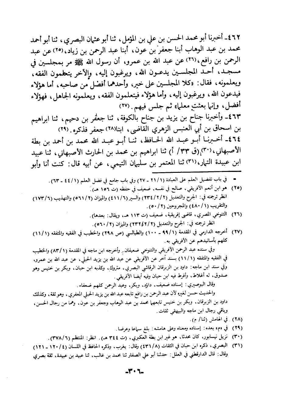 462 - أَخْبَرَنَا أَبُو مُحَمَّدٍ الْحَسَنُ بْنُ عَلِيِّ بْنِ الْمُؤَمَّلِ، ثنا أَبُو عُثْمَانَ الْبَصْرِيُّ، ثنا أَبُو أَحْمَدَ مُحَمَّدُ بْنُ عَبْدِ الْوَهَّابِ، أبنا جَعْفَرُ بْنُ عَوْنٍ، أبنا عَبْدُ الرَّحْمَنِ بْنُ زِيَادٍ، عَنْ عَبْدِ الرَّحْمَنِ بْنِ رَافِعٍ، عَنْ عَبْدِ اللَّهِ بْنِ عَمْرٍو،: أَنَّ رَسُولَ اللَّهِ صَلَّى اللهُ عَلَيْهِ وَسَلَّمَ مَرَّ بِمَجْلِسَيْنِ فِي مَسْجِدٍ: أَحَدُ الْمَجْلِسَيْنِ يدْعُونَ اللَّهَ وَيَرْغَبُونَ إِلَيْهِ، وَالْآخَرُ يَتَعَلَّمُونَ الْفِقْهَ وَيُعَلِّمُونَهُ، فَقَالَ: «§كِلَا الْمَجْلِسَيْنِ عَلَى خَيْرٍ، وَأَحَدُهُمَا أَفْضَلُ مِنْ صَاحِبِهِ، أَمَا هَؤُلَاءِ فَيَدْعَوْنَ اللَّهَ وَيَرْغَبُونَ إِلَيْهِ، وَأَمَّا هَؤُلَاءِ فَيَتَعَلَّمُونَ الْفِقْهَ وَيُعَلَّمُونَهُ الْجَاهِلَ، فَهَؤُلَاءِ أَفْضَلُ وَإِنَّمَا بُعِثْتُ مُعَلِّمًا» ، ثُمَّ جَلَسَ فِيهِمْ،