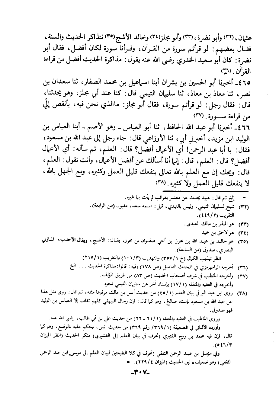 465 - أَخْبَرَنَا أَبُو الْحُسَيْنِ بْنُ بِشْرَانَ، أبنا إِسْمَاعِيلُ بْنُ مُحَمَّدٍ الصَّفَّارُ، ثنا سَعْدَانُ بْنُ نَصْرٍ، ثنا مُعَاذُ بْنُ مُعَاذٍ، ثنا سُلَيْمَانُ التَّيْمِيُّ، قَالَ كُنَّا عِنْدَ أَبِي مِجْلَزٍ وَهُوَ يُحَدِّثُنَا، قَالَ: فَقَالَ رَجُلٌ: لَوْ قَرَأْتُمْ سُورَةً فَقَالَ أَبُو مِجْلَزٍ: §مَا الَّذِي نَحْنُ فِيهِ بِأَنْقَصَ إِلَيَّ مِنْ قِرَاءَةِ سُورَةٍ