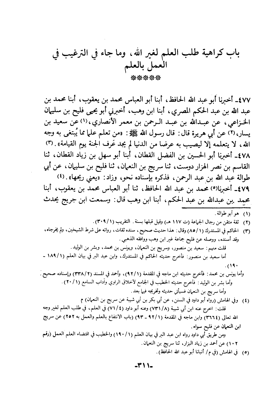 477 - أَخْبَرَنَا أَبُو عَبْدِ اللَّهِ الْحَافِظُ، أبنا أَبُو الْعَبَّاسِ مُحَمَّدُ بْنُ يَعْقُوبَ، أبنا مُحَمَّدُ بْنُ عَبْدِ اللَّهِ بْنِ عَبْدِ الْحَكَمِ الْمِصْرِيُّ، أبنا ابْنُ وَهْبٍ، أَخْبَرَنِي أَبُو يَحْيَى فُلَيْحُ بْنُ سُلَيْمَانَ الْخُزَاعِيُّ، عَنْ عَبْدِ اللَّهِ بْنِ عَبْدِ الرَّحْمَنِ بْنِ مُعْمَرٍالْأَنْصَارِيِّ، عَنْ سَعِيدِ بْنِ يَسَارٍ، عَنْ أَبِي هُرَيْرَةَ، قَالَ: قَالَ رَسُولُ اللَّهِ صَلَّى اللهُ عَلَيْهِ وَسَلَّمَ: §«مَنْ تَعَلَّمَ عِلْمًا مِمَّا يُبْتَغَى بِهِ وَجْهُ اللَّهِ لَا يَتَعَلَّمُهُ إِلَّا لَيُصِيبَ بِهِ عَرَضًا مِنَ الدُّنْيَا لَمْ يَجِدْ عَرْفَ الْجَنَّةِ يوْمَ الْقِيَامَةِ» ،
