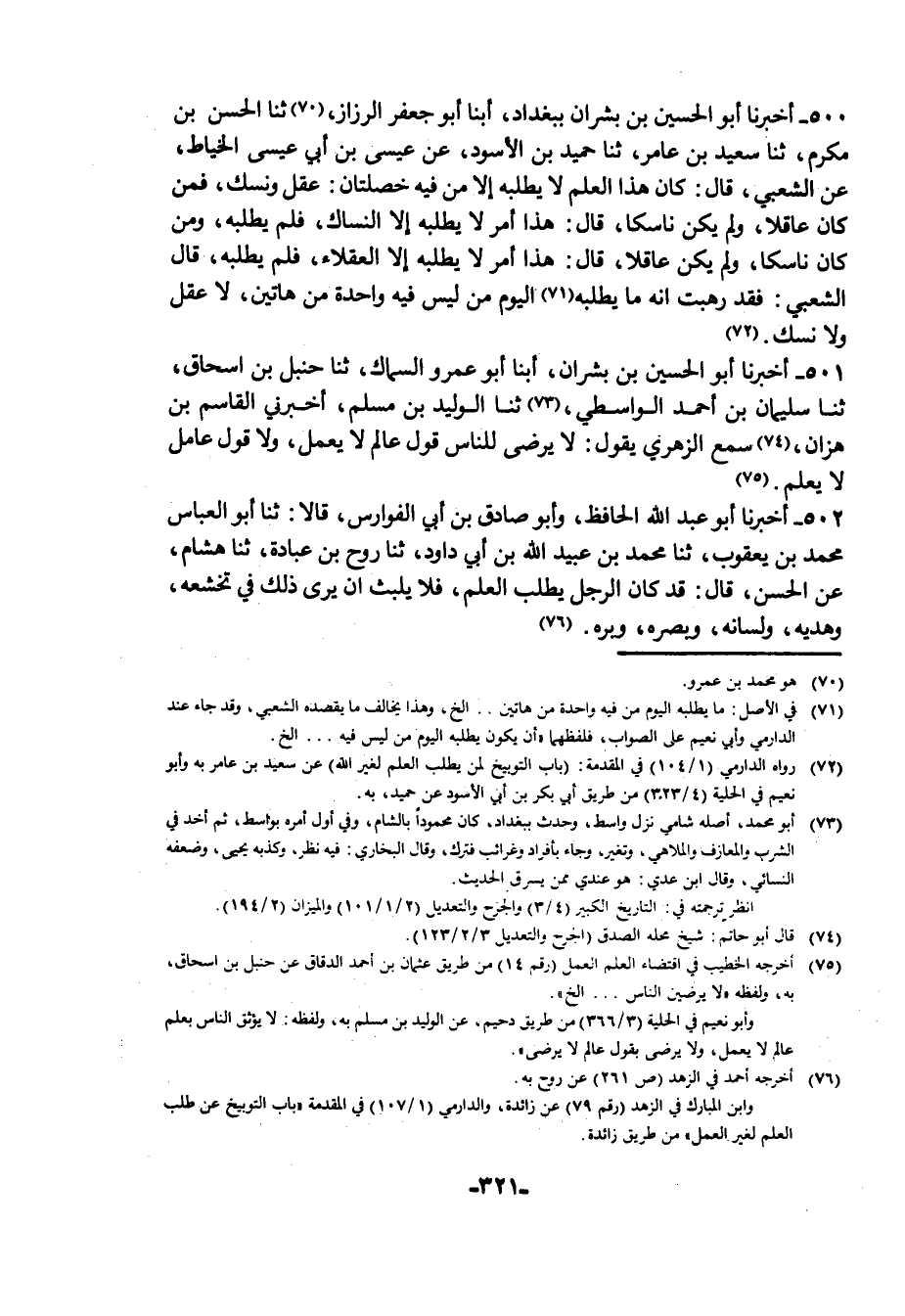 500 - أَخْبَرَنَا أَبُو الْحُسَيْنِ بْنُ بِشْرَانَ، بِبَغْدَادَ أبنا أَبُو جَعْفَرٍ الرَّزَّازُ، ثنا الْحَسَنُ بْنُ مُكْرَمٍ، ثنا سَعِيدُ بْنُ عَامِرٍ، ثنا حُمَيْدُ بْنُ الْأَسْوَدِ، عَنْ عِيسَى بْنِ أَبِي عِيسَى الْحَنَّاطِ، عَنِ الشَّعْبِيِّ، قَالَ: كَانَ هَذَا §الْعِلْمُ لَا يَطْلُبُهُ إِلَّا مَنْ فِيهِ خِصلَتَانِ عَقْلٌ وَنُسُكٌ، فَمَنْ كَانَ عَاقِلًا وَلَمْ يَكُنْ نَاسِكًا، قَالَ: هَذَا أَمْرٌ لَا يَطْلُبُهُ إِلَّا النُّسَّاكُ، فَلَمْ يَطْلُبْهُ، وَمَنْ كَانَ نَاسِكًا وَلَمْ يَكُنْ عَاقِلًا، قَالَ: هَذَا أَمَرٌ لَا يَطْلُبُهُ إِلَّا الْعُقَلَاءُ، فَلَمْ يَطْلُبْهُ، قَالَ الشَّعْبِيُّ: فَقَدْ رَهِبْتُ أَنَّهُ مَا يَطْلُبُهُ الْيَوْمَ مَنْ لَيْسَ فِيهِ وَاحِدَةٌ مِنْ هَاتَيْنِ لَا عَقْلٌ وَلَا نُسُكٌ