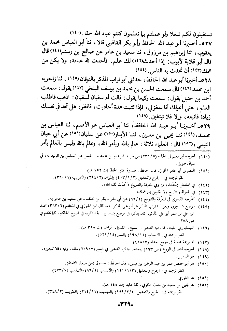 529 - أَخْبَرَنَا أَبُو عَبْدِ اللَّهِ الْحَافِظُ، ثنا أَبُو الْعَبَّاسِ هُوَ الْأَصَمُّ، ثنا الْعَبَّاسُ بْنُ مُحَمَّدٍ، ثنا يَحْيَى بْنُ مَعِينٍ، ثنا الْأَبَّارُ، عَنْ سُفْيَانَ، عَنْ أَبِي حَيَّانَ التَّيْمِيِّ، قَالَ: §الْعُلَمَاءُ ثَلَاثَةٌ: عَالِمٌ بِاللَّهِ وَبِأَمْرِ اللَّهِ، وَعَالِمٌ بِاللَّهِ وَلَيْسَ بِالْعَالِمِ بِأَمْرِ -[330]- اللَّهِ، وَعَالِمٌ بِأَمْرِ اللَّهِ وَلَيْسَ بِعَالِمٍ بِاللَّهِ، وَأَمَّا الْعَالِمُ بِاللَّهِ وَبِأَمْرِهِ فَذَاكَ الْخَائِفُ لِلَّهِ وَالْعَالِمُ بِسُنَنِهِ وَحُدُودِهِ وَفَرَائِضِهِ، وَأَمَّا الْعَالِمُ بِاللَّهِ وَلَيْسَ بِعَالِمٍ بِأَمْرِ اللَّهِ فَذَاكَ الْخَائِفُ لِلَّهِ وَلَيْسَ بِعَالِمٍ بِسُنَنِهِ وَلَا حُدُودِهِ وَلَا فَرَائِضِهِ، وَأَمَّا الْعَالِمُ بِأَمْرِ اللَّهِ وَلَيْسَ بِعَالِمٍ بِاللَّهِ فَذَاكَ الْعَالِمُ بِسُنَنِهِ وَحُدُودِهِ وَفَرَائِضِهِ وَلَيْسَ بِخَائِفٍ لَهُ