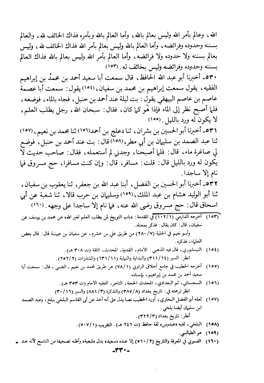531 - أَخْبَرَنَا أَبُو الْحُسَيْنِ بْنُ بِشْرَانَ، ثنا دَعْلَجُ بْنُ أَحْمَدَ، ثنا مُحَمَّدُ بْنُ نُعَيْمٍ، ثنا عَبْدُ الصَّمَدِ بْنُ سُلَيْمَانَ بْنِ أَبِي مَطَرٍ، قَالَ: بِتُّ عِنْدَ أَحْمَدَ بْنِ حَنْبَلٍ فَوَضَعَ لِي صَاغِرَةَ مَاءٍ، قَالَ: فَلَمَّا أَصْبَحْنَا وَجَدَنِي لَمِ اسْتَعْمَلْهُ، فَقَالَ: «§صَاحِبُ حَدِيثٍ لَا يَكُونُ لَهُ وِرْدٌ بِاللَّيْلِ» قَالَ: قُلْتُ: مُسَافِرٌ؟، قَالَ: وَإِنْ كُنْتَ مُسَافِرًا، حَجَّ مَسْرُوقٌ فَمَا نَامَ إِلَّا سَاجِدًا "