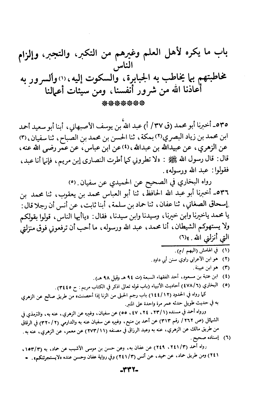 535 - أَخْبَرَنَا أَبُو مُحَمَّدٍ عَبْدُ اللَّهِ بْنُ يُوسُفَ الْأَصْبَهَانِيُّ، أبنا أَبُو سَعِيدٍ أَحْمَدُ بْنُ مُحَمَّدِ بْنِ زِيَادٍ الْبَصْرِيُّ بِمَكَّةَ، ثنا الْحَسَنُ بْنُ مُحَمَّدِ بْنِ الصَّبَّاحِ، ثنا سُفْيَانُ، عَنِ الزُّهْرِيِّ، عَنْ عُبَيْدِ اللَّهِ بْنِ عَبْدِ اللَّهِ، عَنِ ابْنِ عَبَّاسٍ، عَنْ عُمَرَ، رَضِيَ اللَّهُ عَنْهُ قَالَ: قَالَ رَسُولُ اللَّهِ صَلَّى اللهُ عَلَيْهِ وَسَلَّمَ: " §لَا تُطْرُونِي كَمَا أَطْرَتِ النَّصَارَى ابْنَ مَرْيَمَ، فَإِنَّمَا أَنَا عَبْدٌ فَقُولُوا: عَبْدُ اللَّهِ وَرَسُولُهُ "، رَوَاهُ الْبُخَارِيُّ فِي الصَّحِيحِ عَنِ الْحُمَيْدِيِّ عَنْ سُفْيَانَ