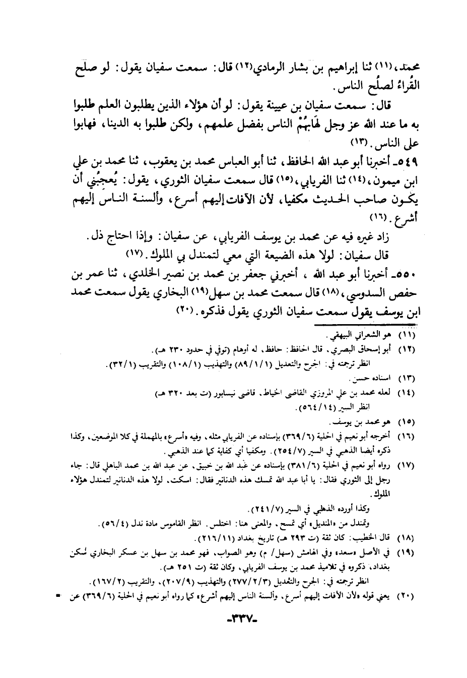 549 - أَخْبَرَنَا أَبُو عَبْدِ اللَّهِ الْحَافِظُ، ثنا أَبُو الْعَبَّاسِ مُحَمَّدُ بْنُ يَعْقُوبَ، ثنا مُحَمَّدُ بْنُ عَلِيِّ بْنِ مَيْمُونَ، ثنا الْفِرْيَابِيُّ، قَالَ: سَمِعْتُ سُفْيَانَ الثَّوْرِيَّ، يَقُولُ: §يُعْجِبُنِي أَنْ يَكُونَ صَاحِبُ الْحَدِيثِ مَكْفِيًا، لِأَنَّ الْآفَاتِ إِلَيْهِمْ أَسْرَعُ وَأَلْسِنَةَ النَّاسِ إِلَيْهِمْ أَشْرَعُ، زَادَ غَيْرُهُ فِيهِ عَنْ مُحَمَّدِ بْنِ يُوسُفَ الْفِرْيَابِيِّ عَنْ سُفْيَانَ وَإِذَا احْتَاجَ ذَلَّ، قَالَ سُفْيَانُ: لَوْلَا هَذِهِ الضَّيْعَةُ الَّتِي مَعِي لَتَمَنْدَلَ بِي الْمُلُوكُ،
