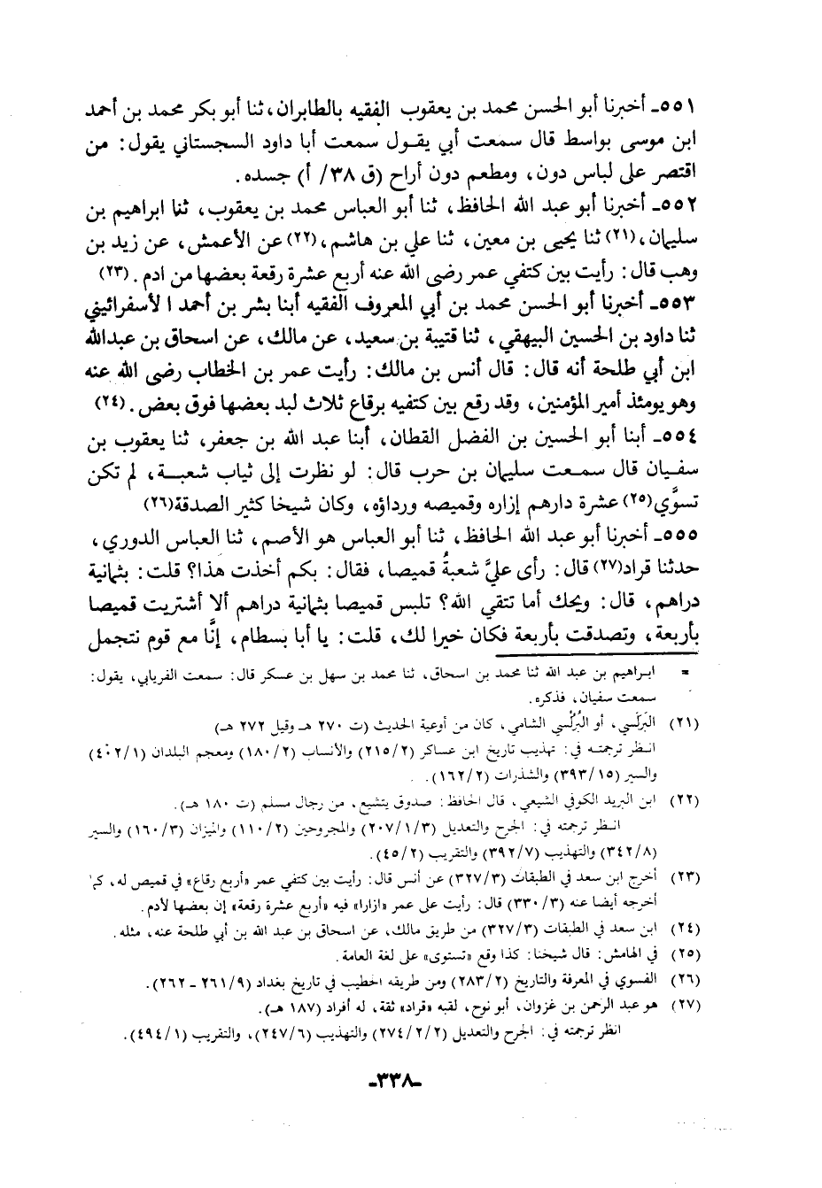 554 - أبنا أَبُو الْحُسَيْنِ بْنُ الْفَضْلِ الْقَطَّانُ، أبنا عَبْدُ اللَّهِ بْنُ جَعْفَرٍ، ثنا يَعْقُوبُ بْنُ سُفْيَانَ، قَالَ: سَمِعْتُ سُلَيْمَانَ بْنَ حَرْبٍ، قَالَ: §لَوْ نَظَرْتَ إِلَى ثِيَابِ شُعْبَةَ لَمْ تَكُنْ تَسْوَى عَشَرَةَ دَرَاهِمَ إِزَارُهُ وَقَمِيصُهُ وَرِدَاؤُهُ وَكَانَ شَيْخًا كَثِيرَ الصَّدَقَةِ